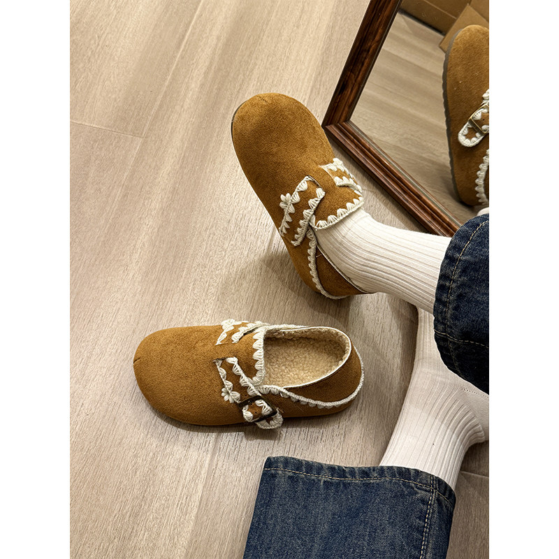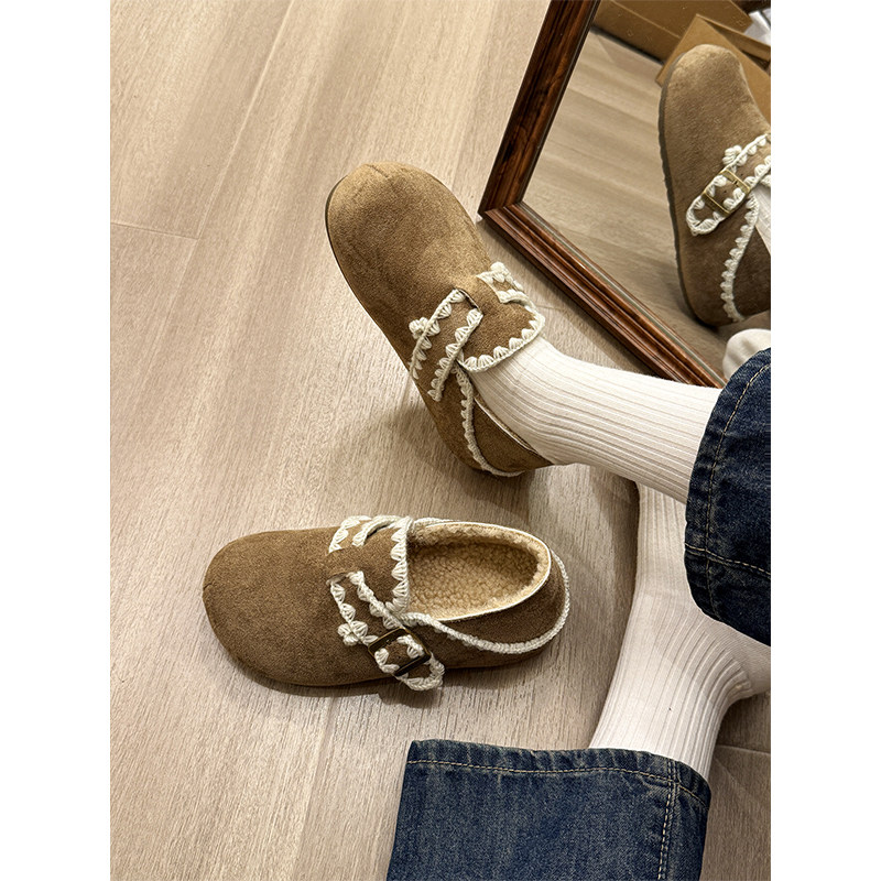 羊皮版复古玛丽珍鞋女方头秋冬季加绒保暖毛毛棉鞋平底晚晚单鞋女