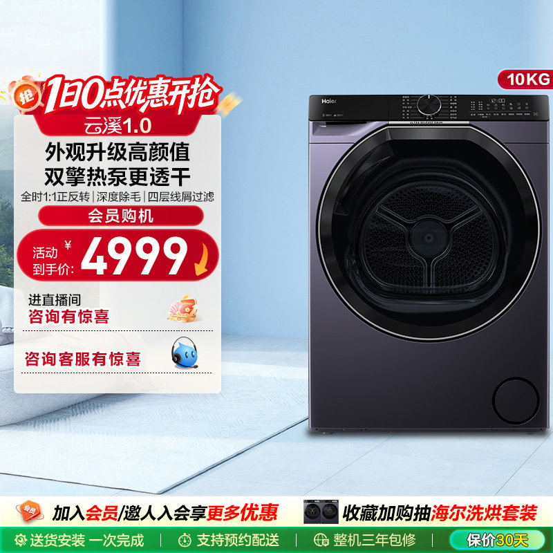 [云溪冠军版]海尔超薄双擎热泵10kg家用全自动滚筒烘干机557B