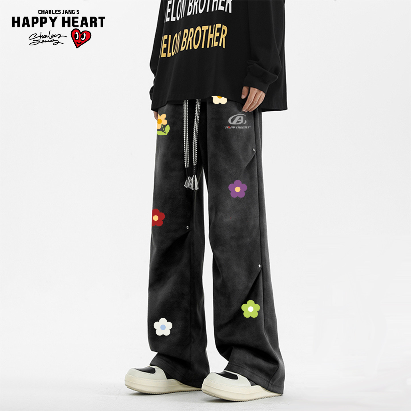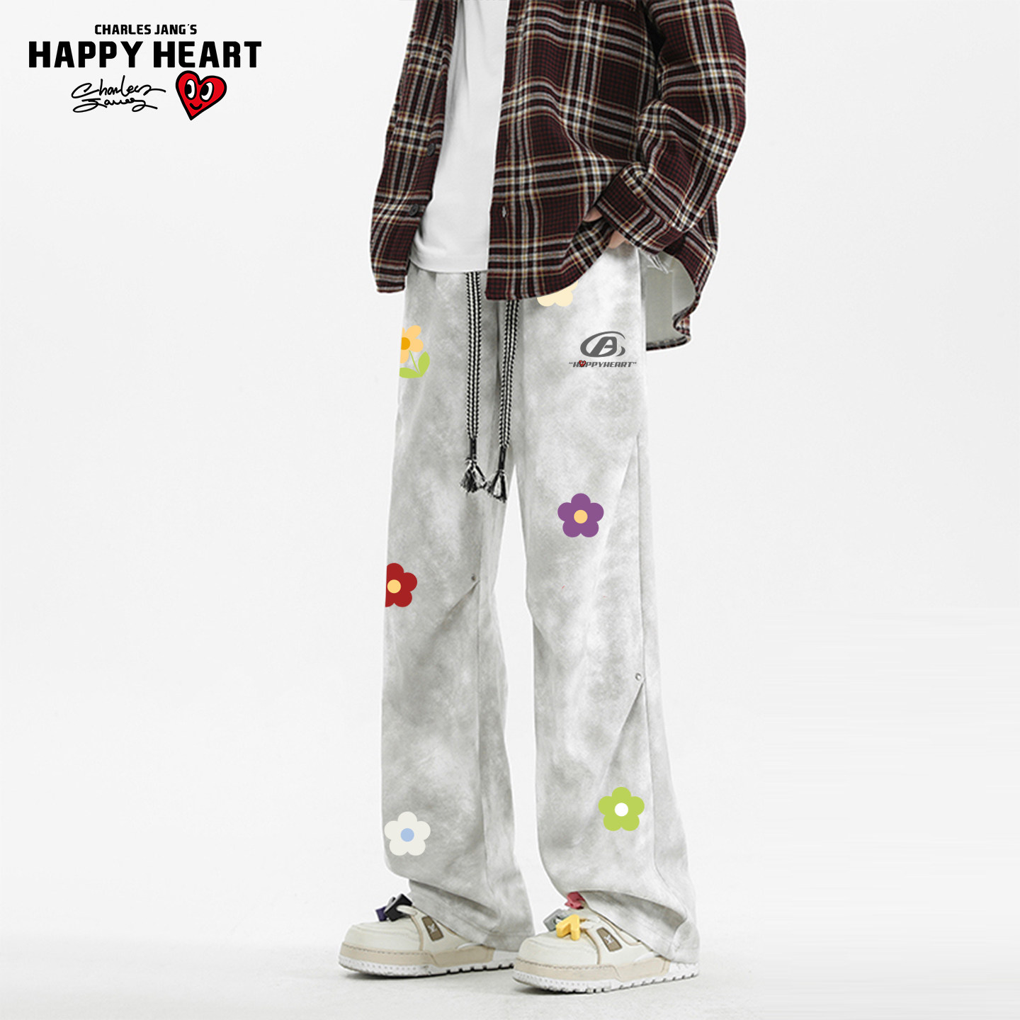 查尔斯桃心美式花卉印花扎染休闲裤男女春秋季情侣休闲运动长裤子