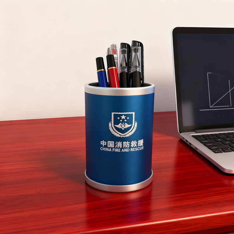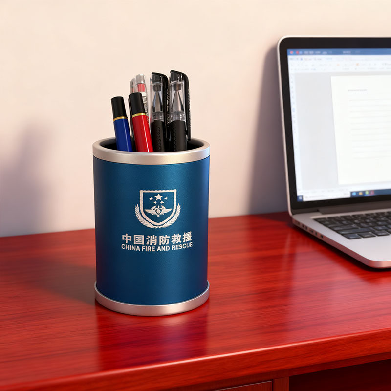 消防员可文具定制黑红金属笔筒创意金蓝铝合金笔插圆形笔座银色笔