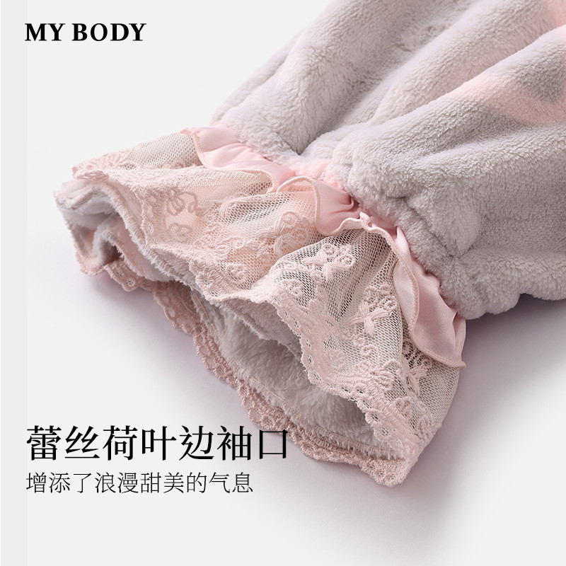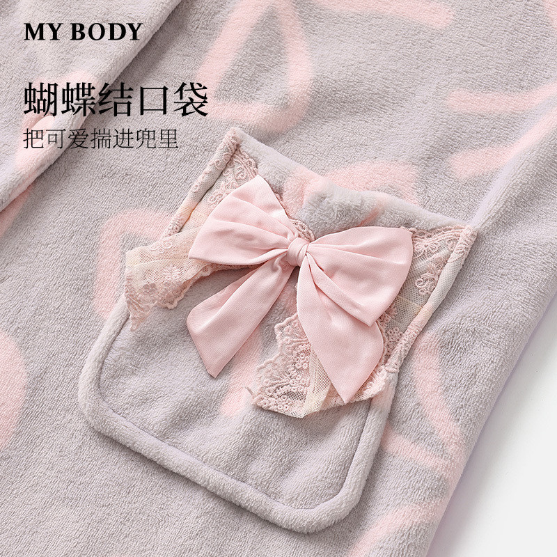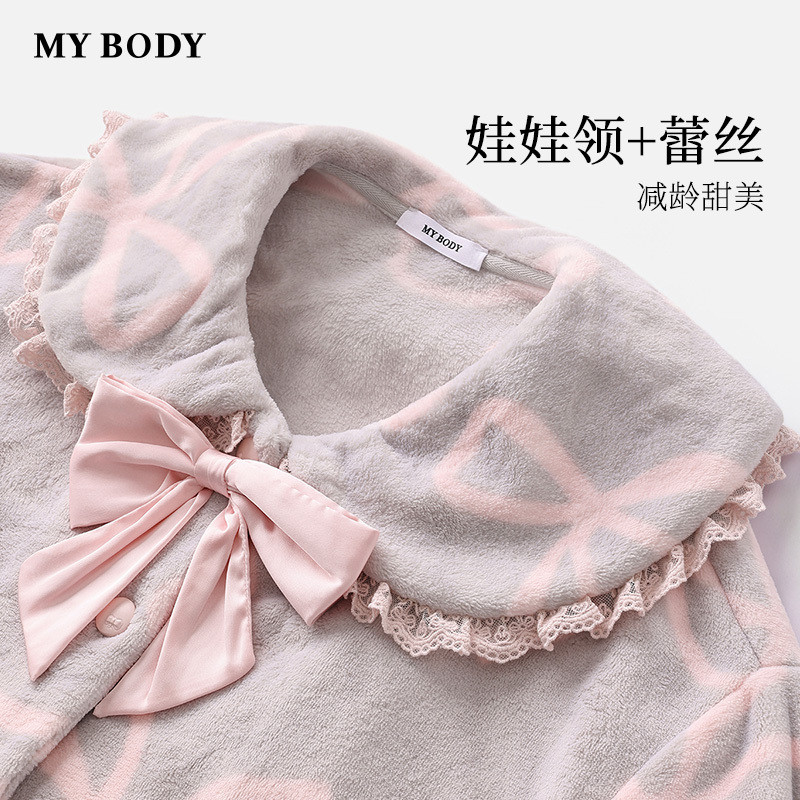 商场同款MYBODY冬季新款睡袍蕾丝娃娃领暖绒绒蝴蝶结家居服浴袍女