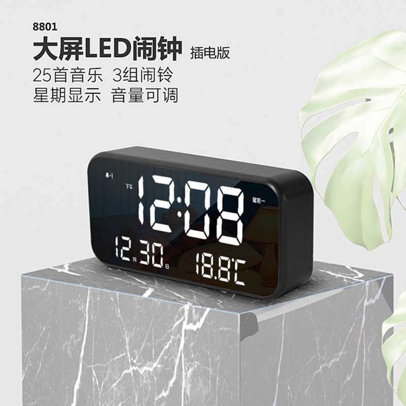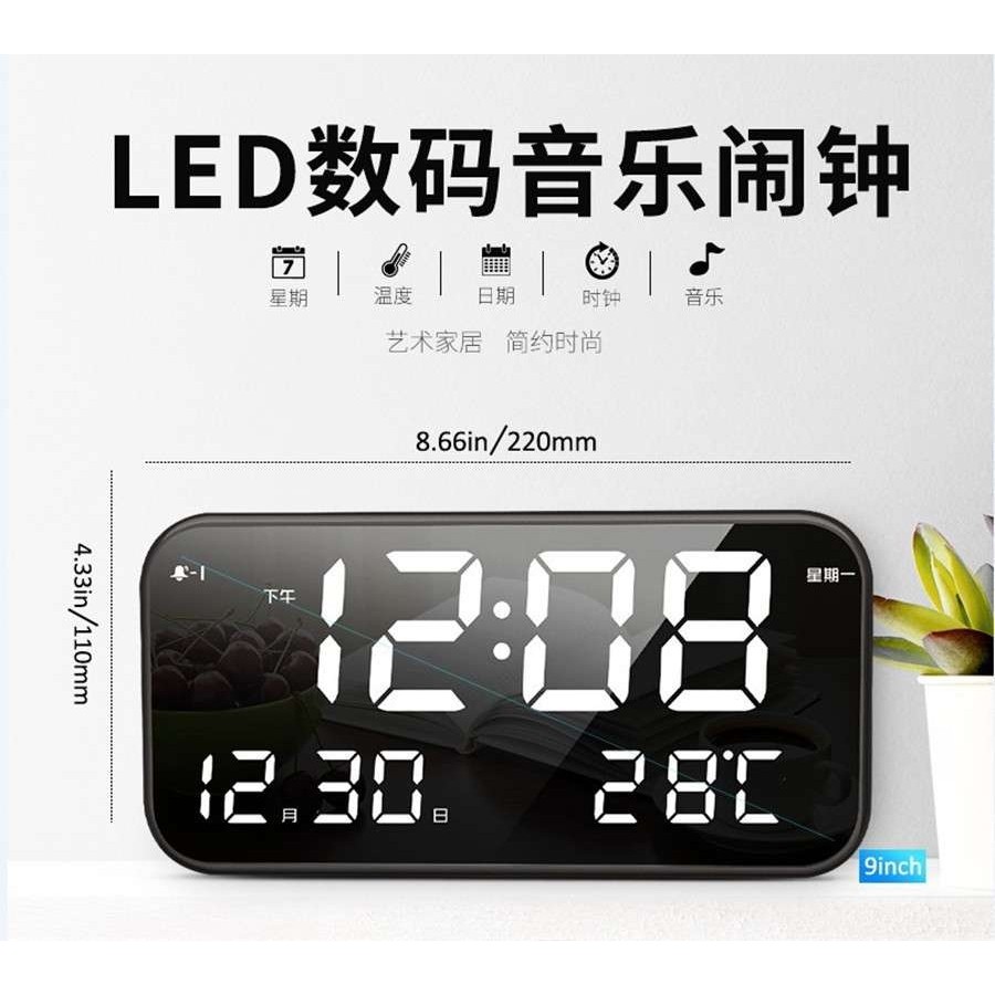 充电版多功能静音镜面闹钟儿童学生大屏数字工作日LED音乐台钟