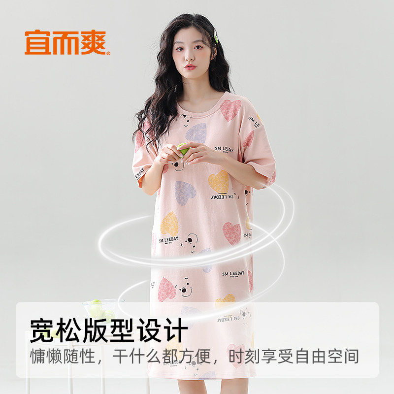宜而爽女士睡衣棉圆领家居服宽松带bra中长款连衣裙可外穿家居裙