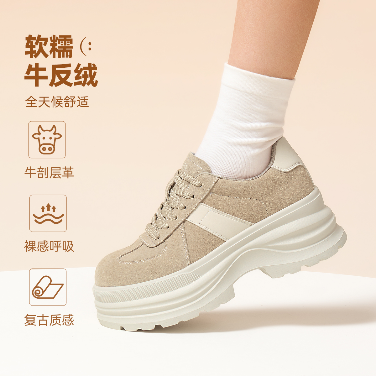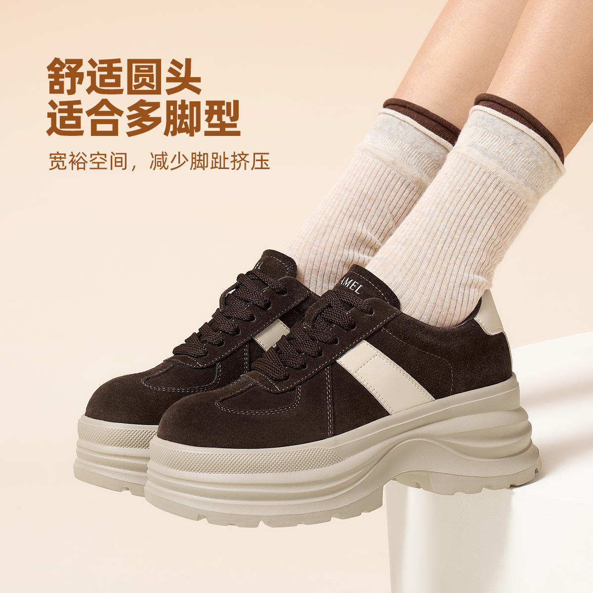 骆驼女鞋2026春季新款复古松糕鞋厚底增高蛋糕鞋休闲鞋德训鞋板鞋