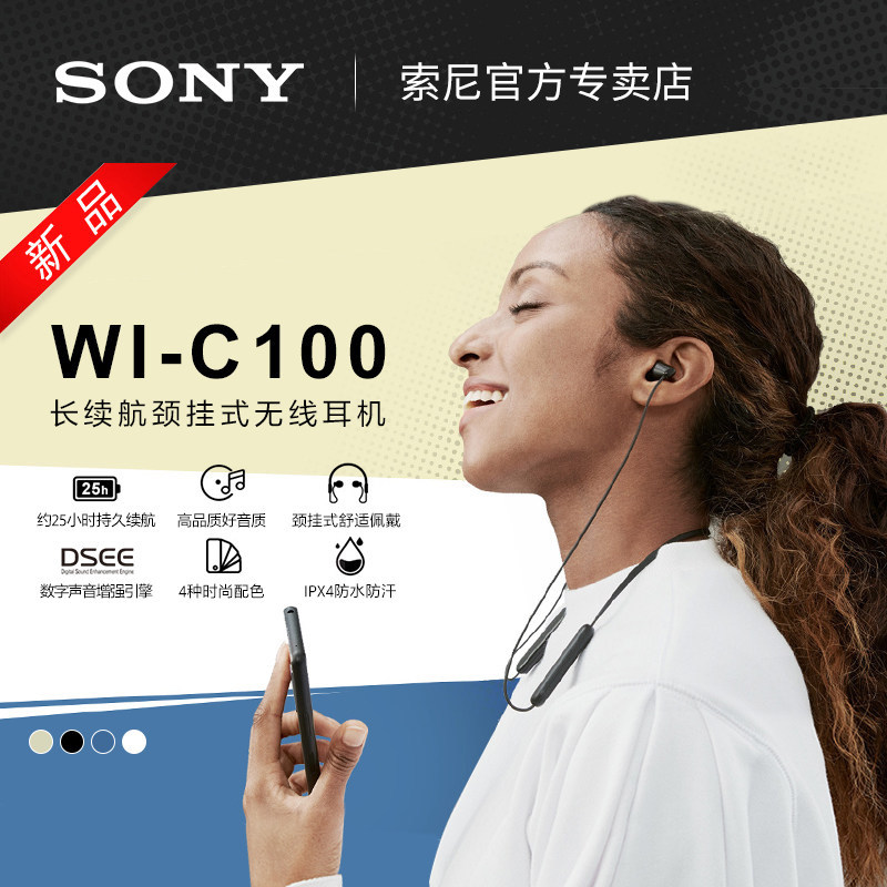 Sony/索尼 WI-C100 颈挂脖式无线蓝牙耳机长续航运动跑步防水防汗