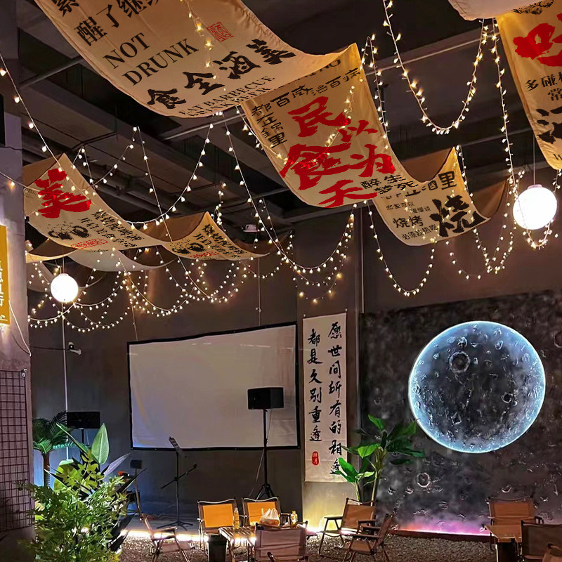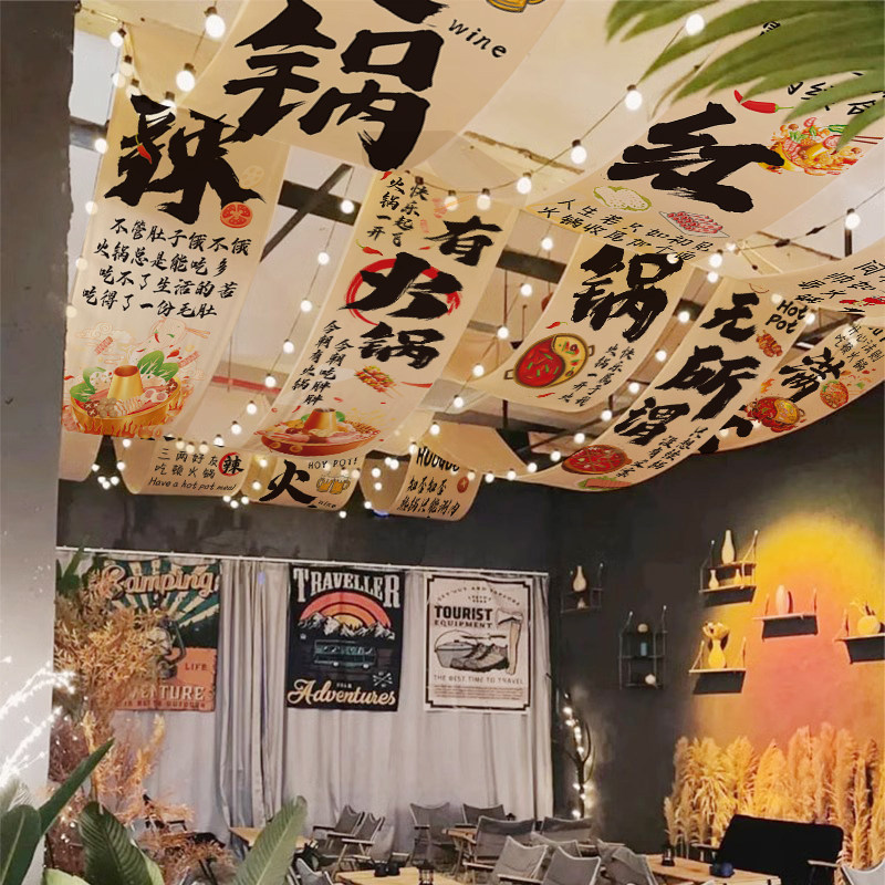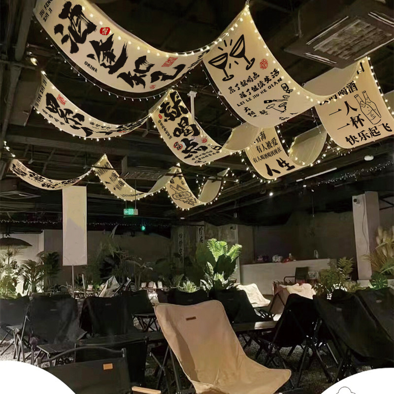 网红天幕吊顶挂布定制餐厅烧烤店中式书法氛围长条装饰火锅古风诗词文化布置露营风旗帜室内小酒馆天花板条幅
