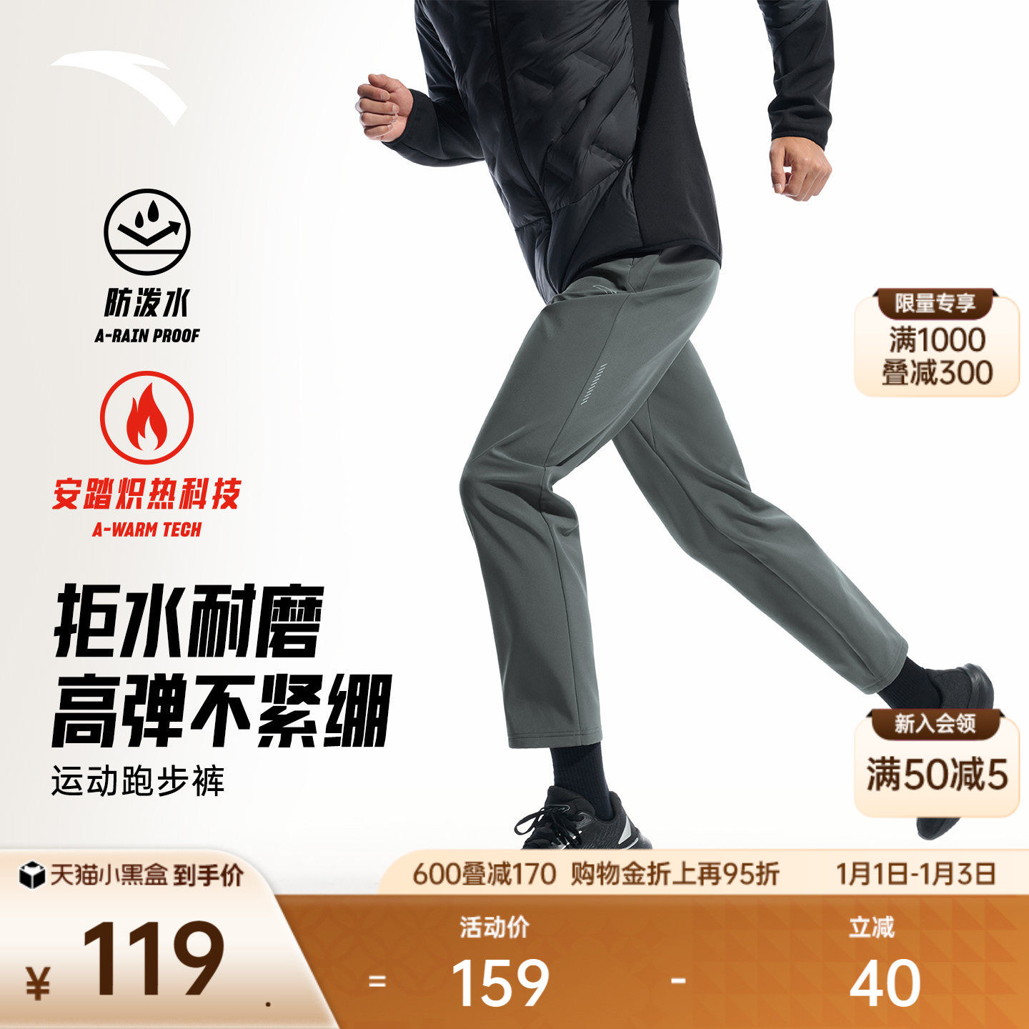 安踏防泼水运动长裤男2025冬季新款加绒保暖跑步训练直筒运动裤子
