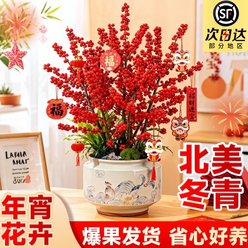 进口北美冬青红果真花带果盆栽鲜切花鲜花老桩盆景绿植物空运保鲜