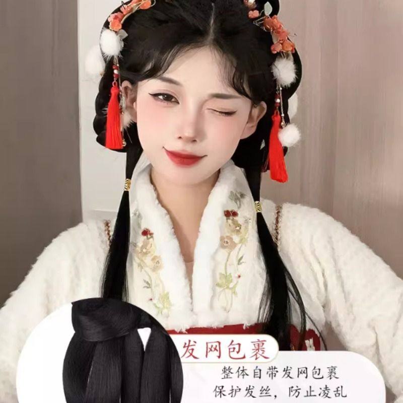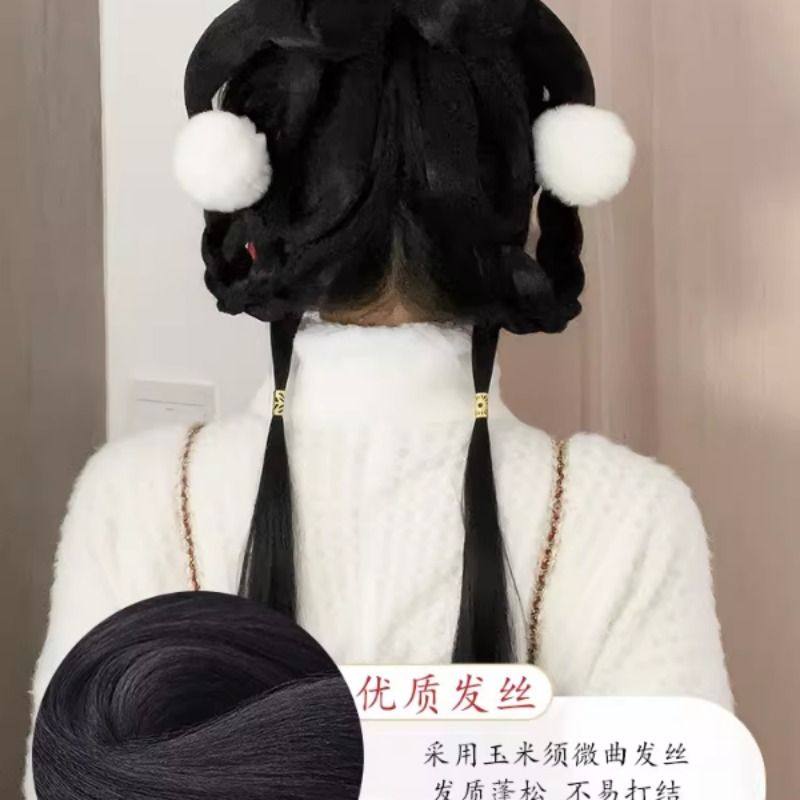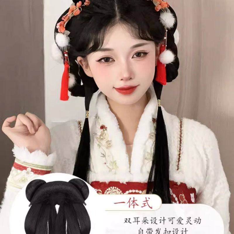 儿童汉服假发一体式古风盘发发髻女童蝴蝶结发包古装头饰垫发造型