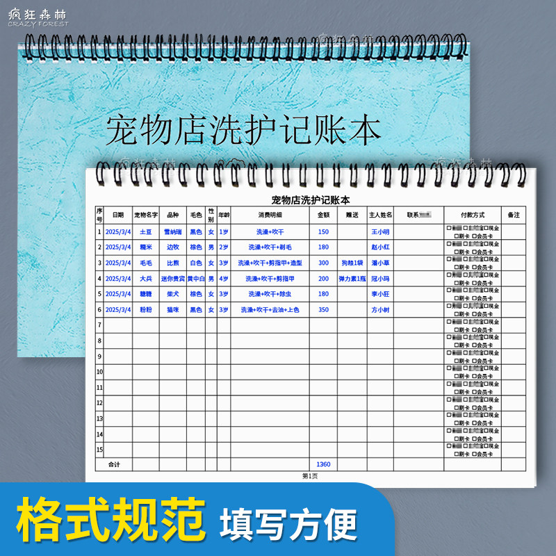 宠物店洗护记账本宠物店前台登记表宠物美容洗澡消费明细本宠物店每日营业登记本宠物洗澡护理消费记录本