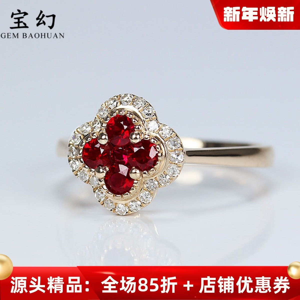 18k玫瑰金天然鸽血红宝石幸运四叶草戒指 深红色伴钻石指环套装