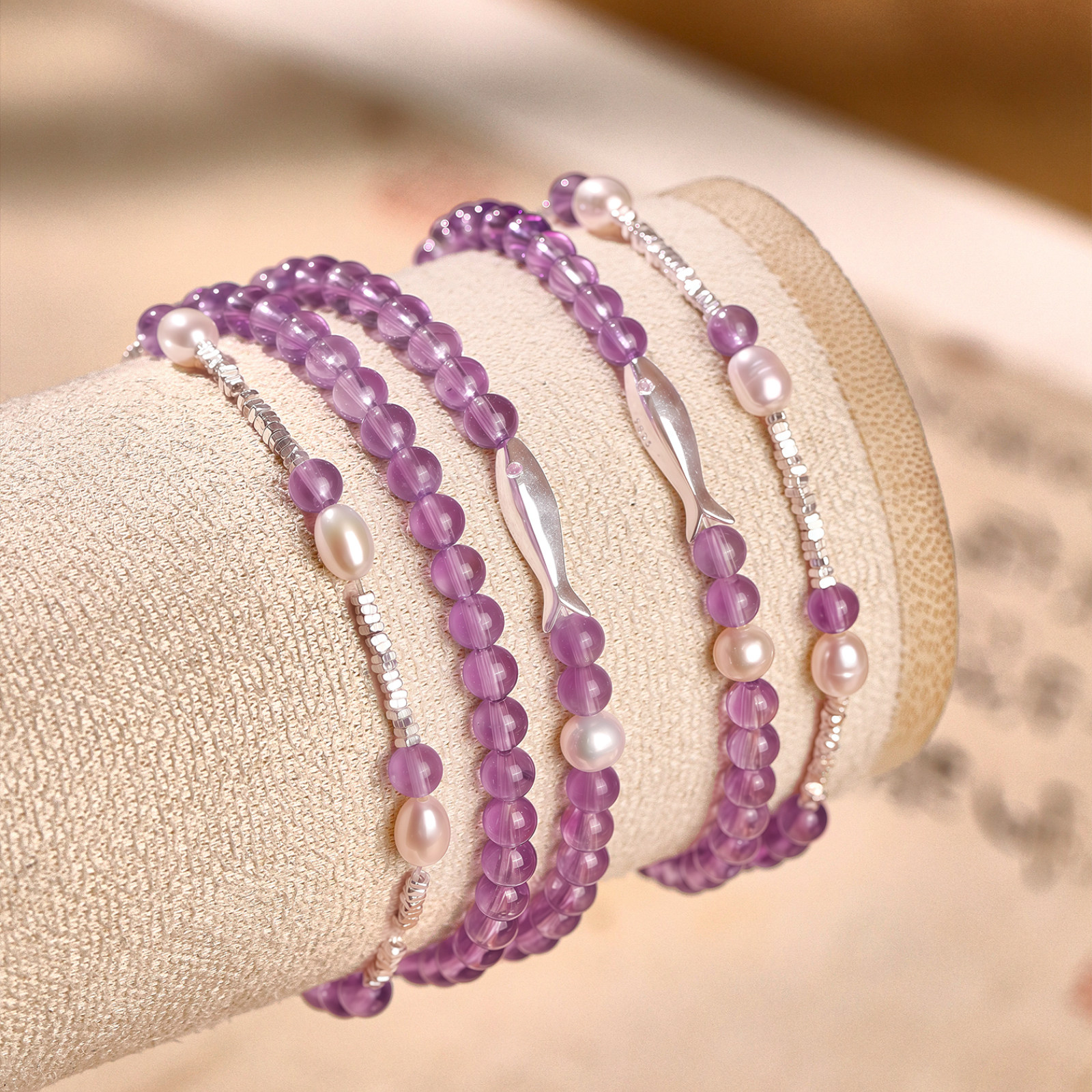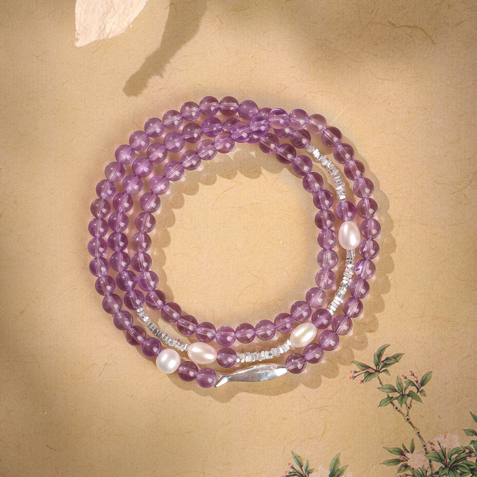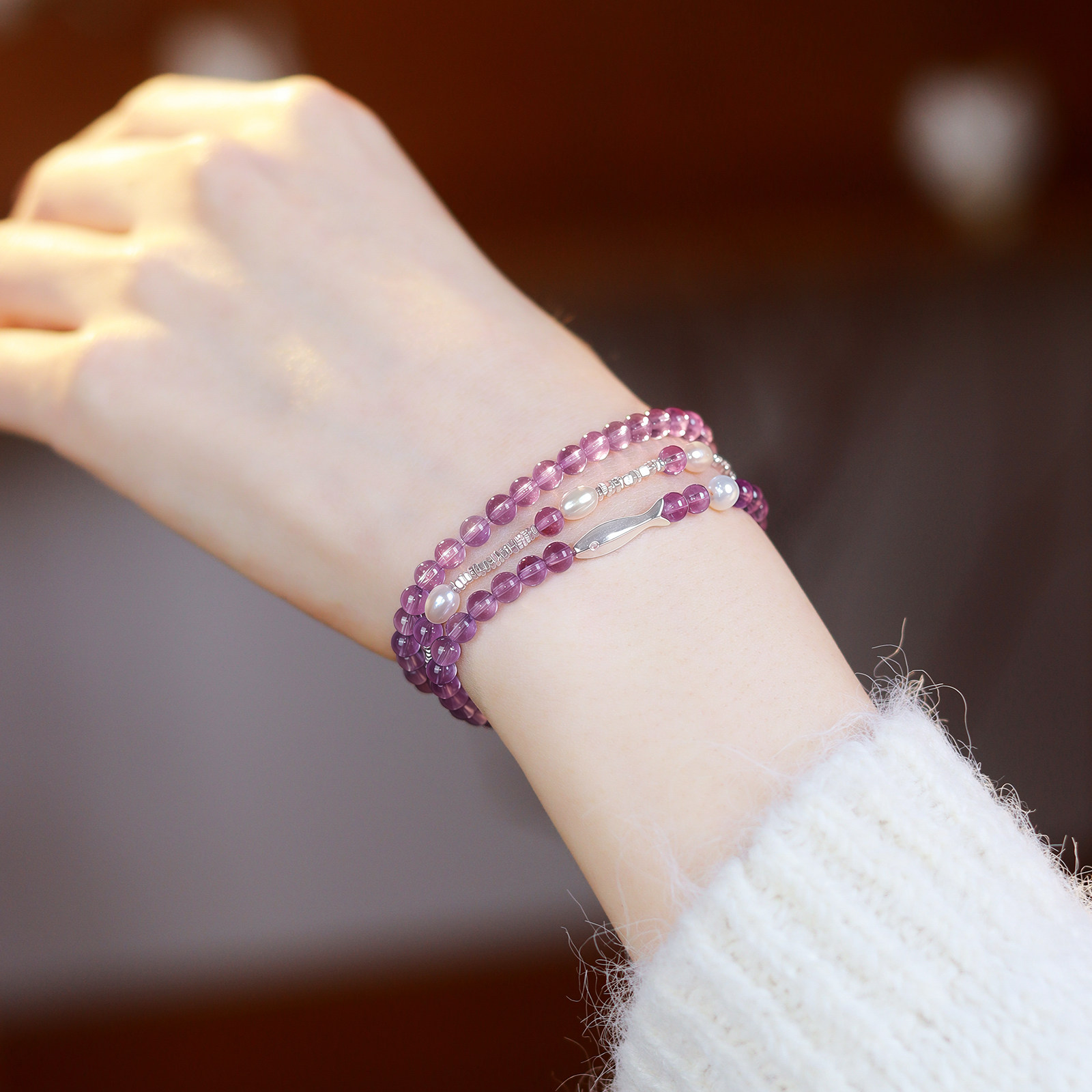 紫鳞跃纯天然紫水晶手串女款纯银碎银子珍珠手链轻奢小众精致爆款