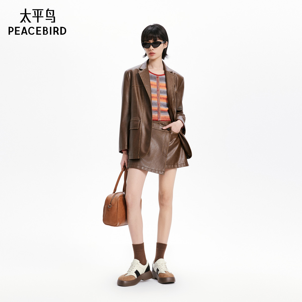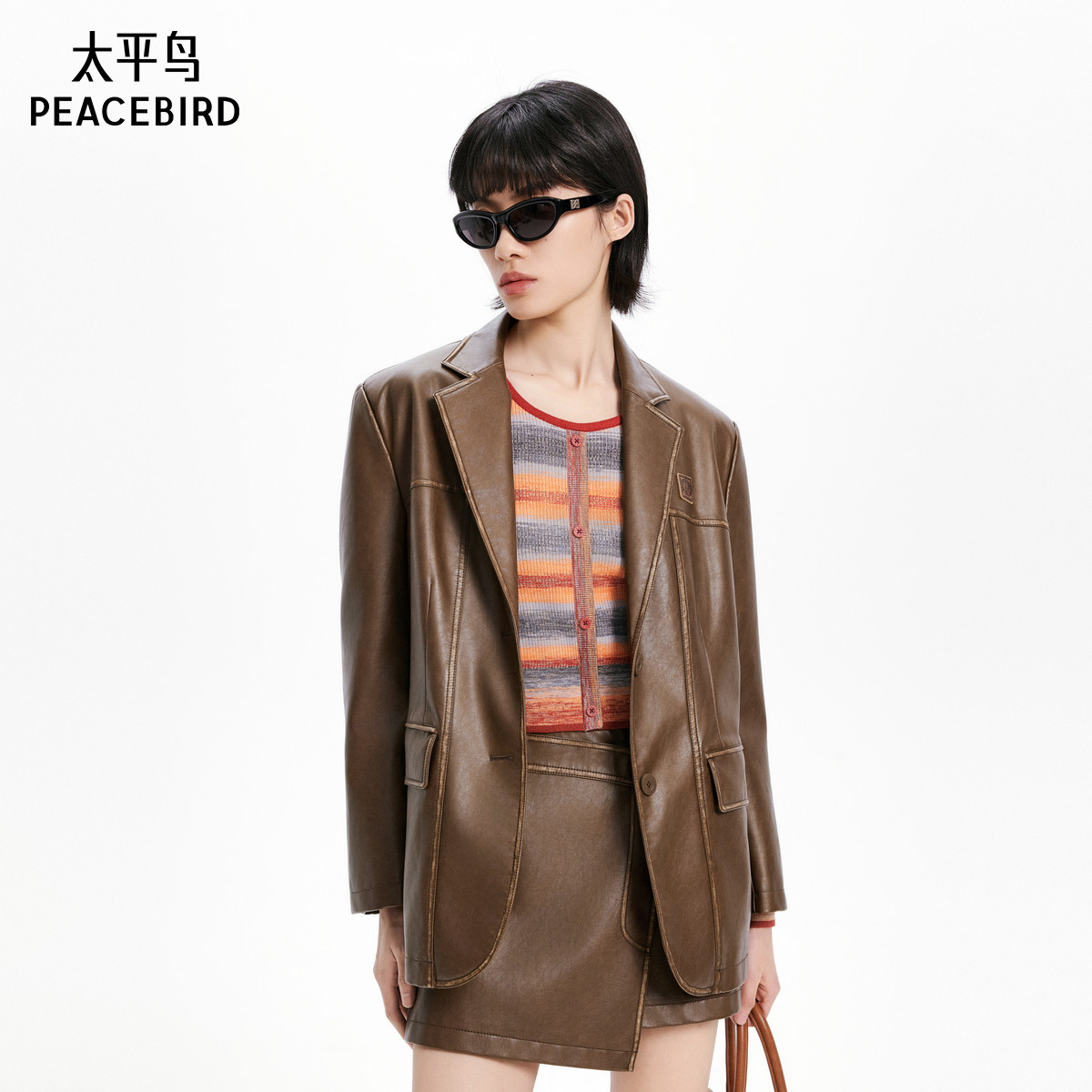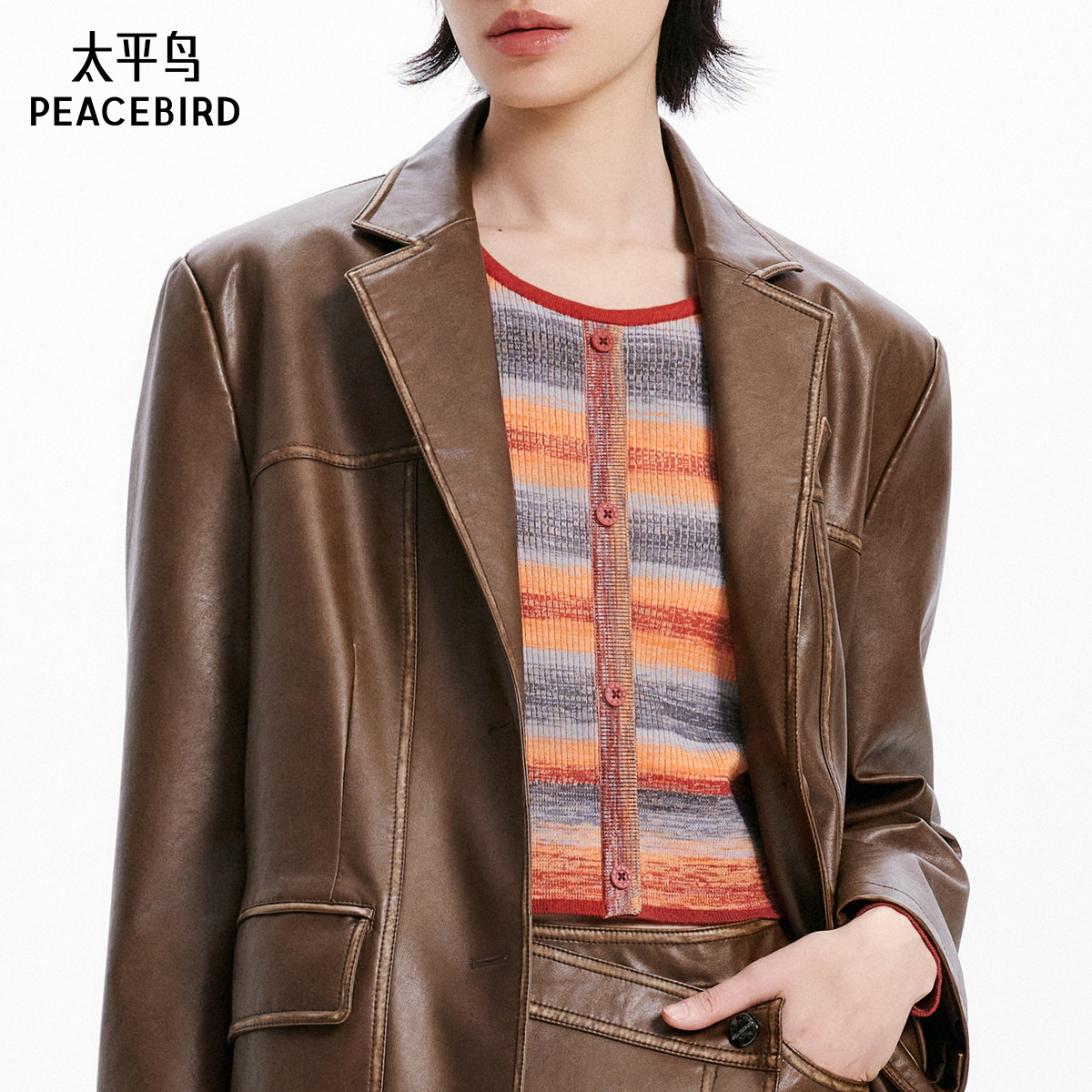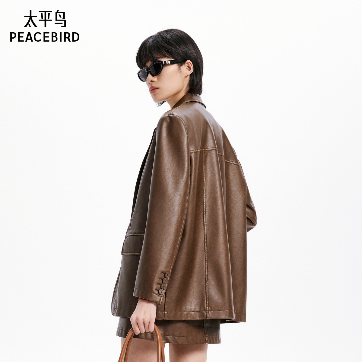 太平鸟女装秋季款擦色PU皮衣西装外套女品质夹克外套A3BAE3469