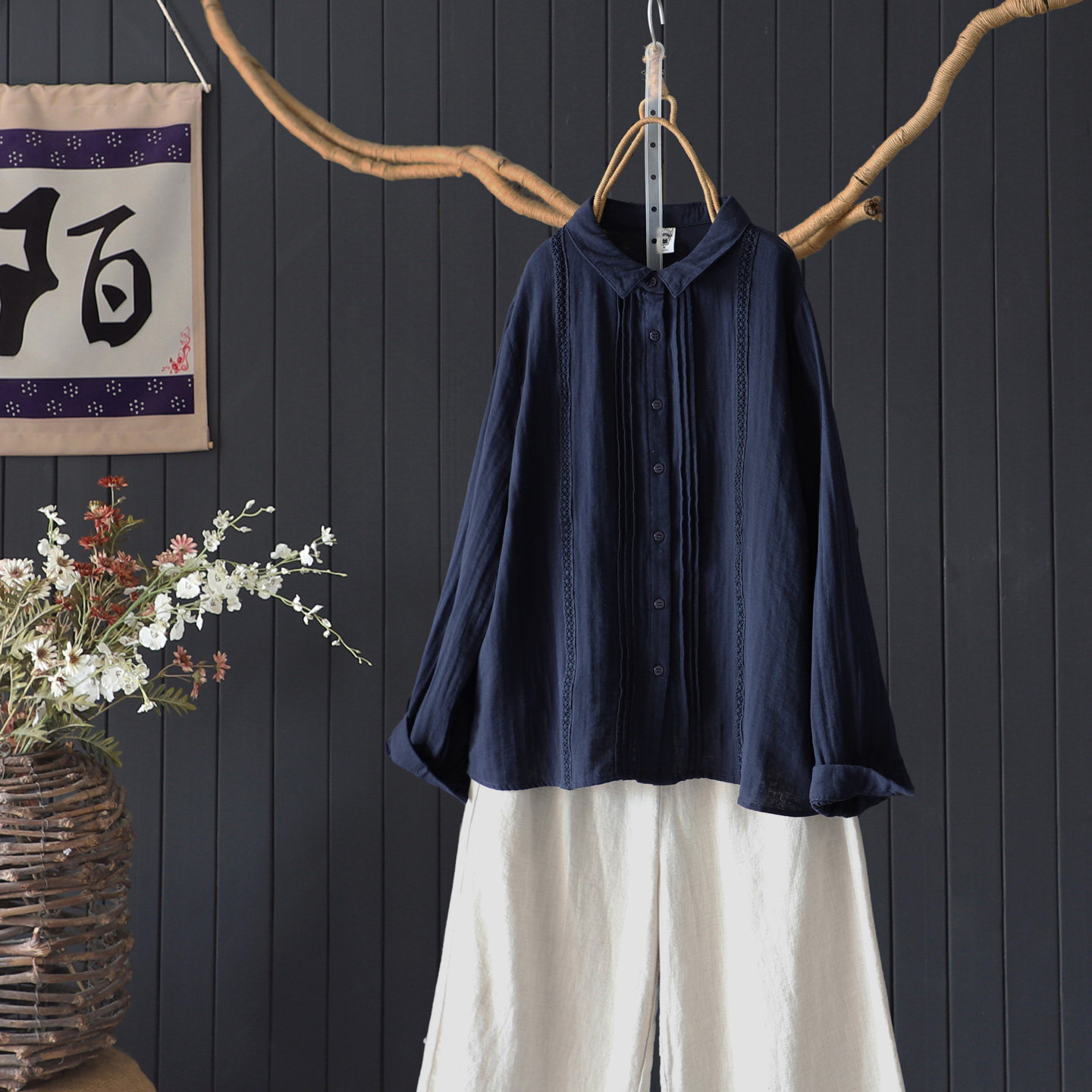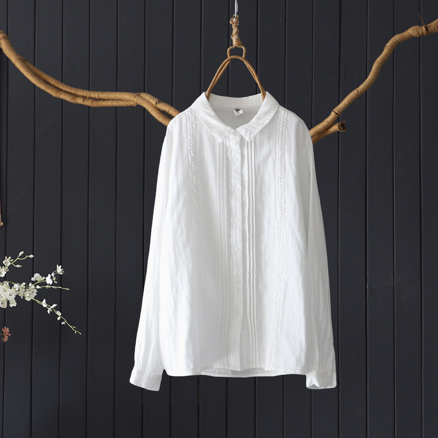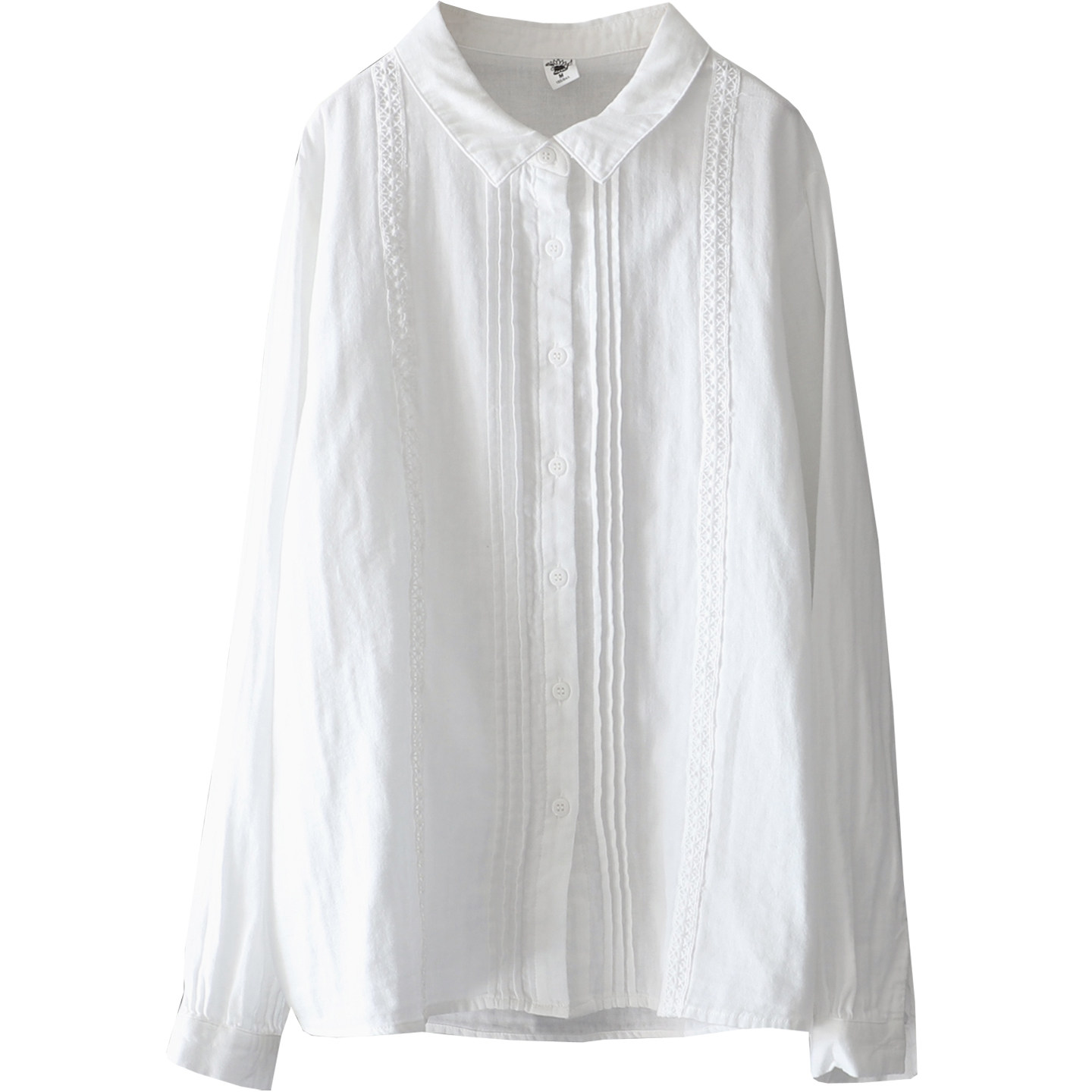 秋季纯色双层棉纱上衣宽松显瘦翻领蕾丝拼接风琴褶皱100%棉衬衫女