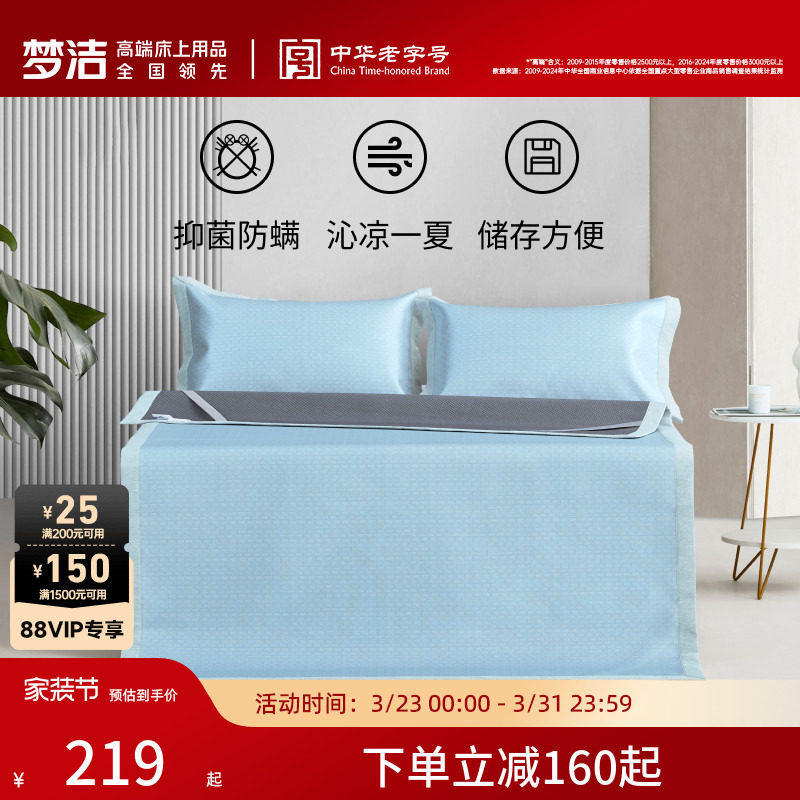 梦洁家纺抗菌冰丝凉席套件三件套床上用品1.8m床软席空调床单席子