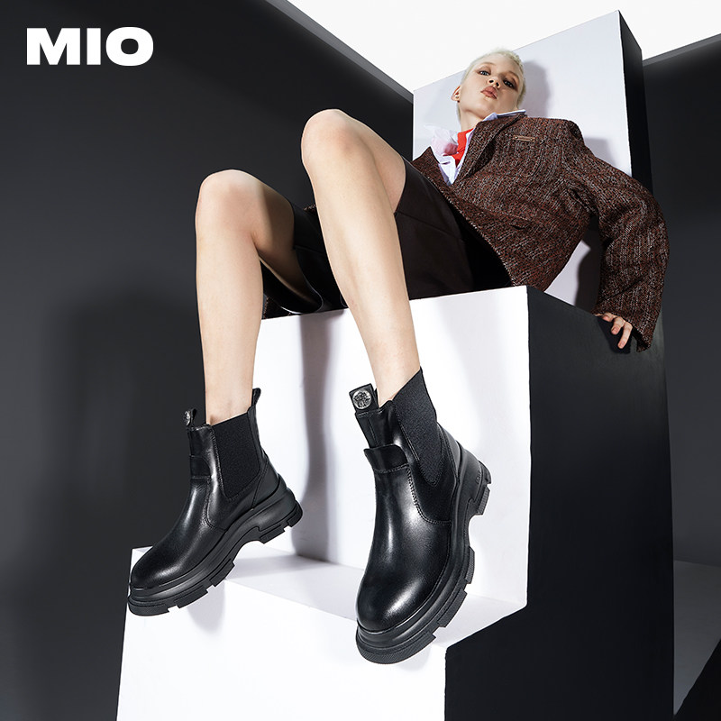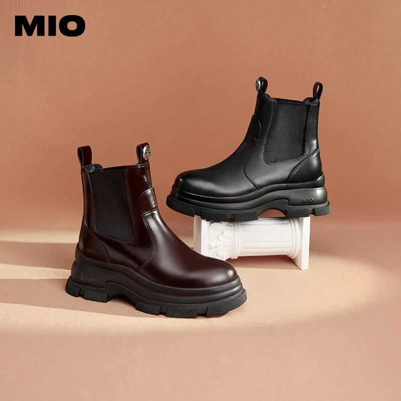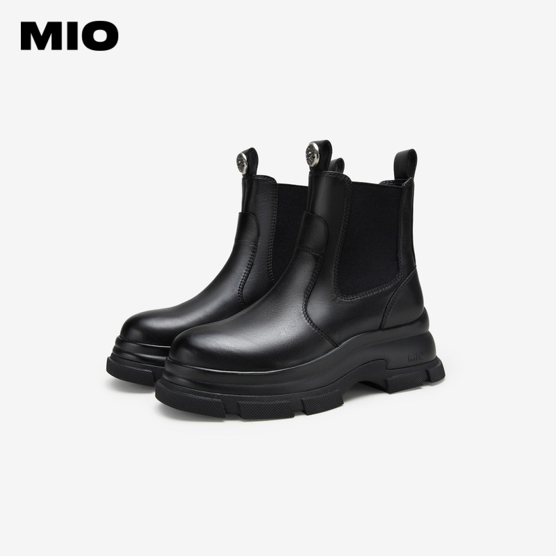 MIO米奥冬季纯色圆头靴子高跟靴子英伦风短筒显瘦厚底切尔西靴