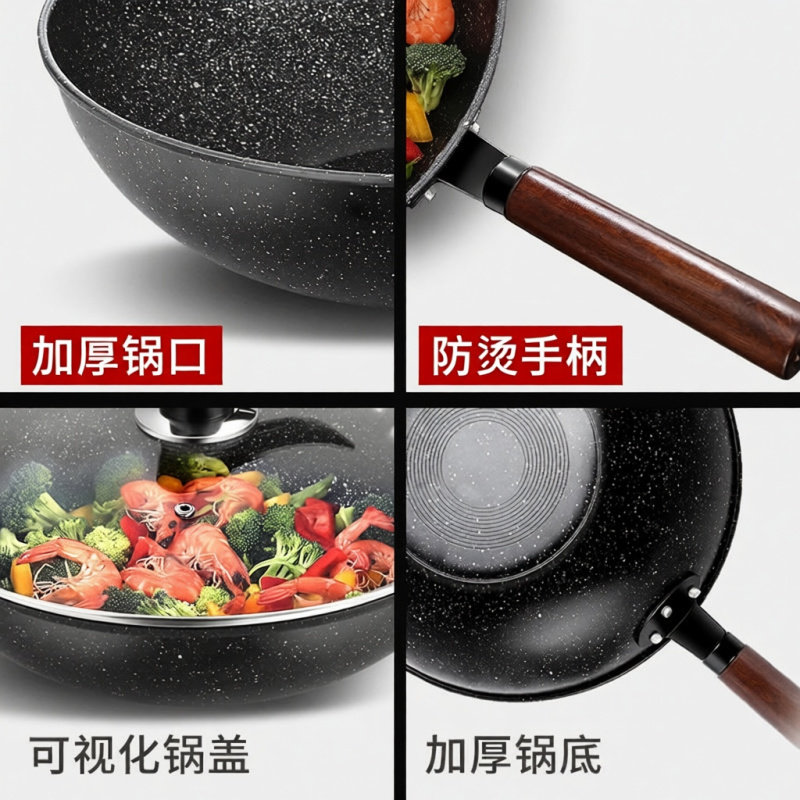 麦饭石30cm无油烟炒菜锅具带盖电磁炉燃气灶通用不粘熟铁