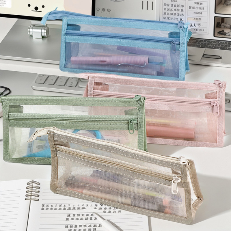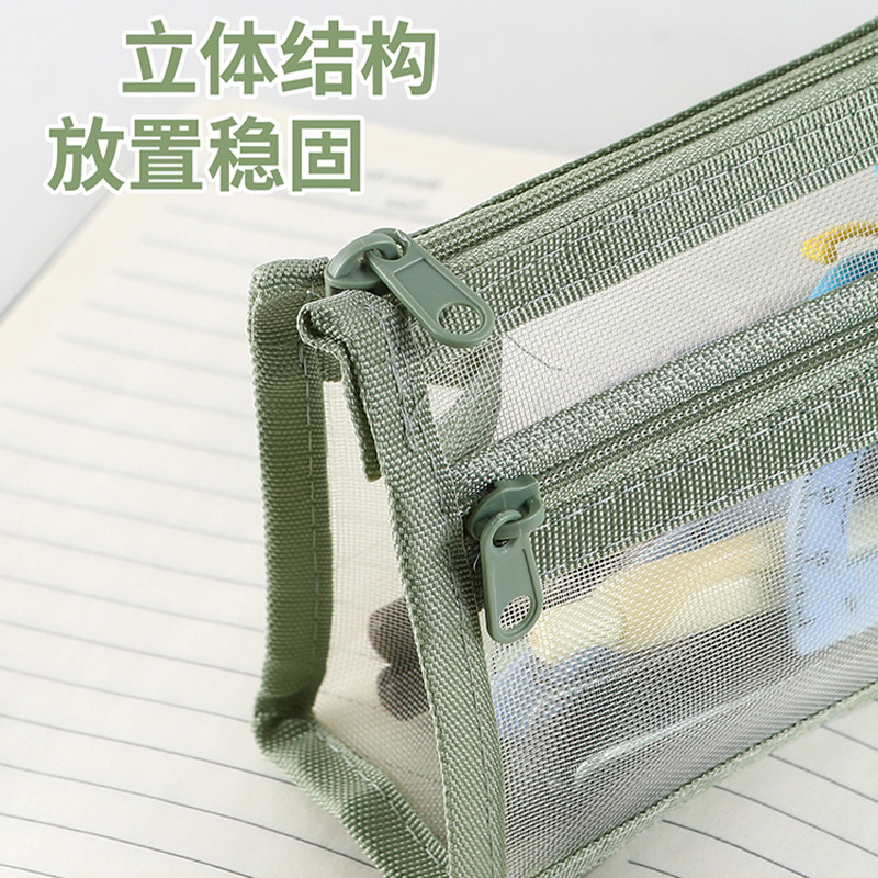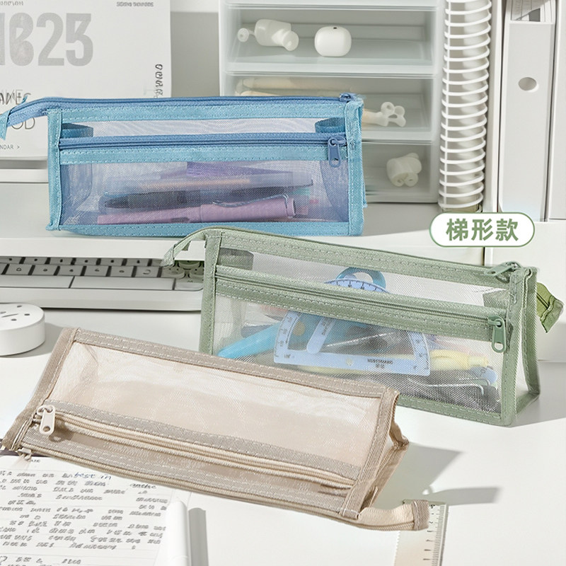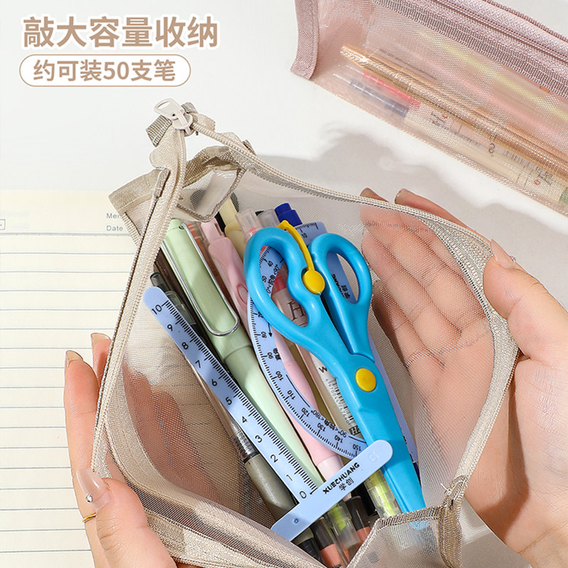 网纱莫兰迪笔袋ins简约透明双层大容量文具学生考试拉链收纳袋