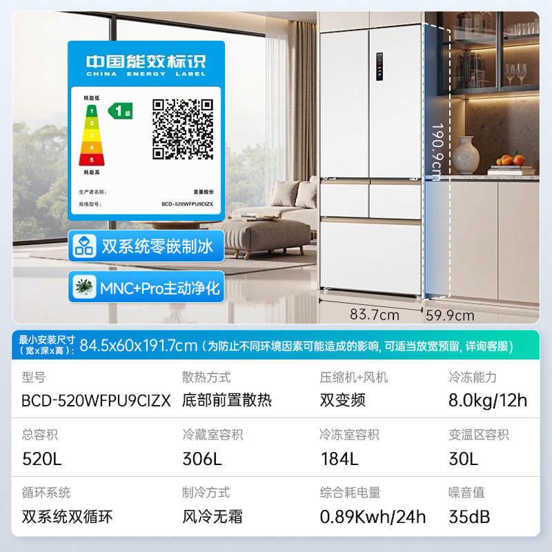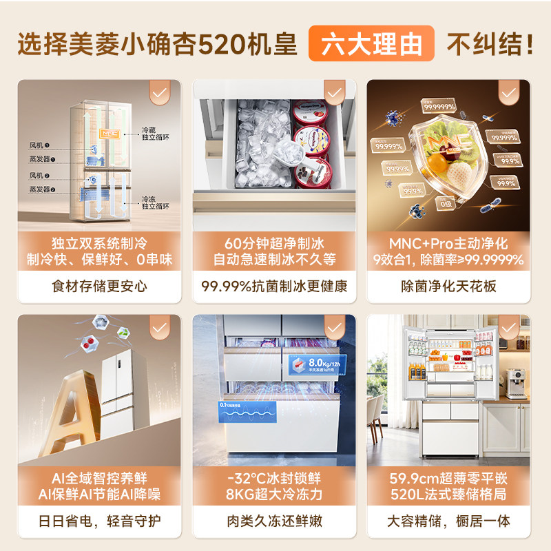 【新品首发】美菱小确杏机皇520L法式双系统制冰冰箱家用超薄嵌入