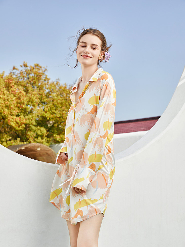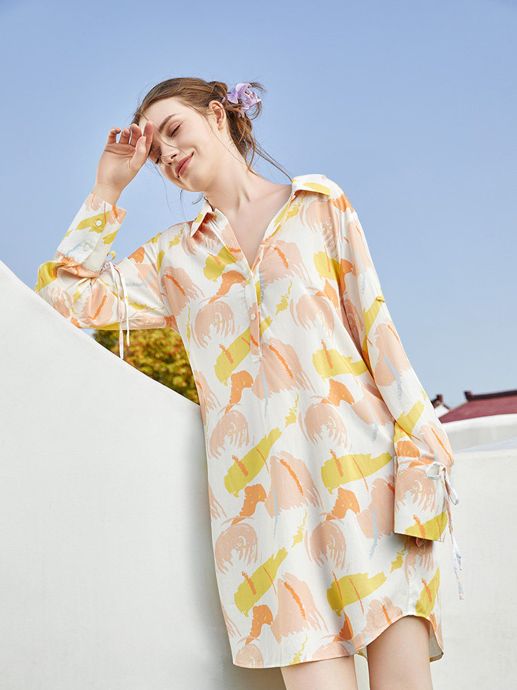 NoirTease春夏薄款性感衬衫睡裙女印花长袖翻领睡衣家居服可外穿