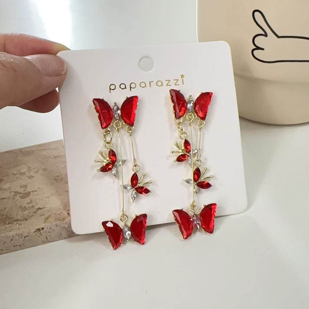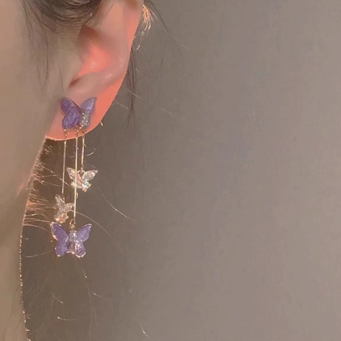 S925银针紫色水晶蝴蝶耳环女轻奢高级感气质简约长款流苏耳坠潮款