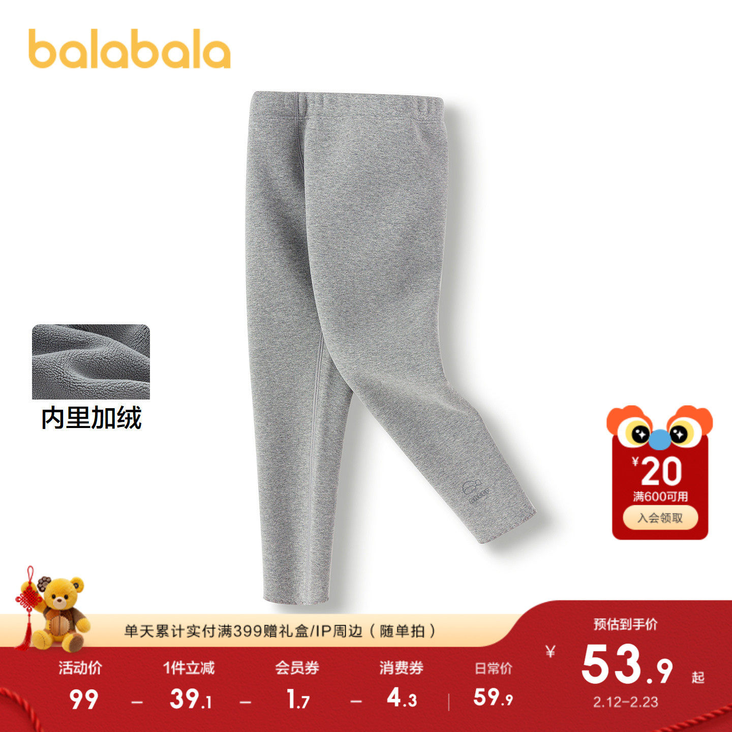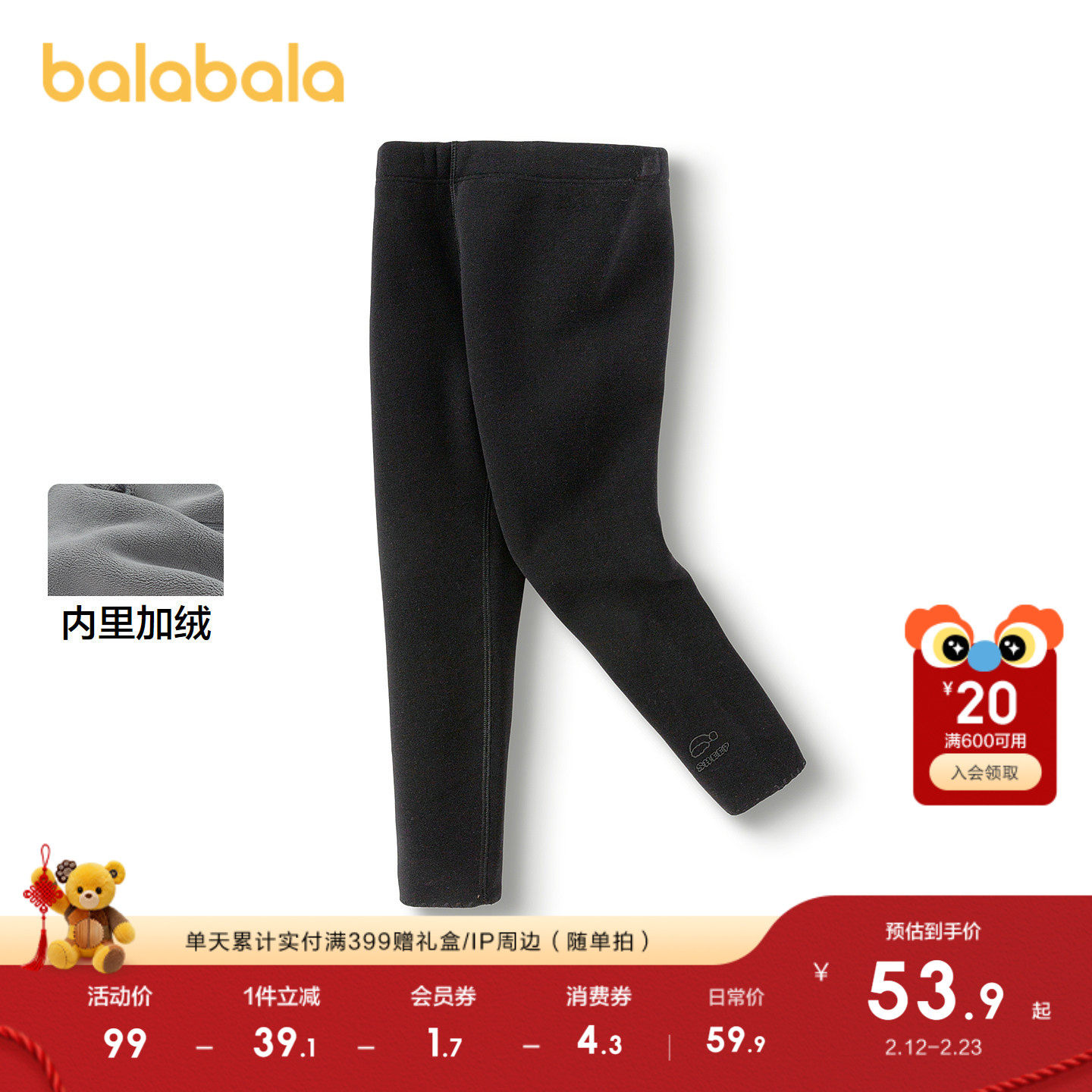 巴拉巴拉童装儿童打底裤加绒保暖女童裤子秋冬长裤时尚百搭休闲裤