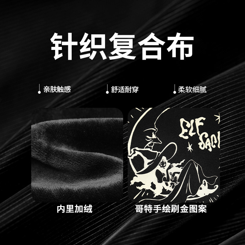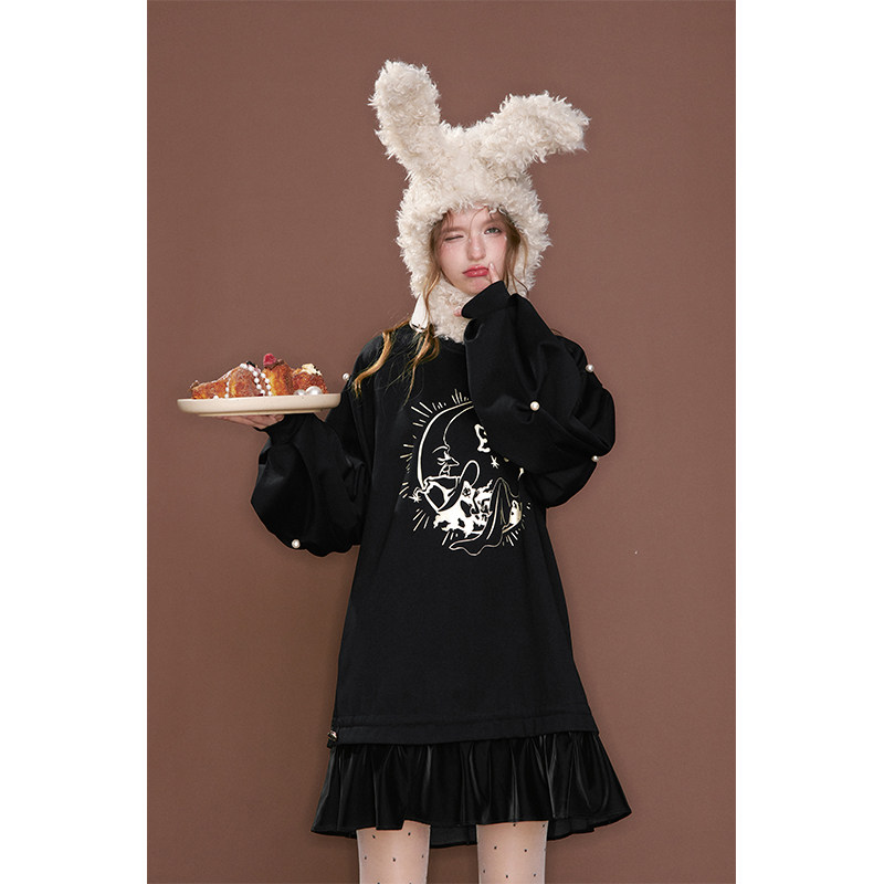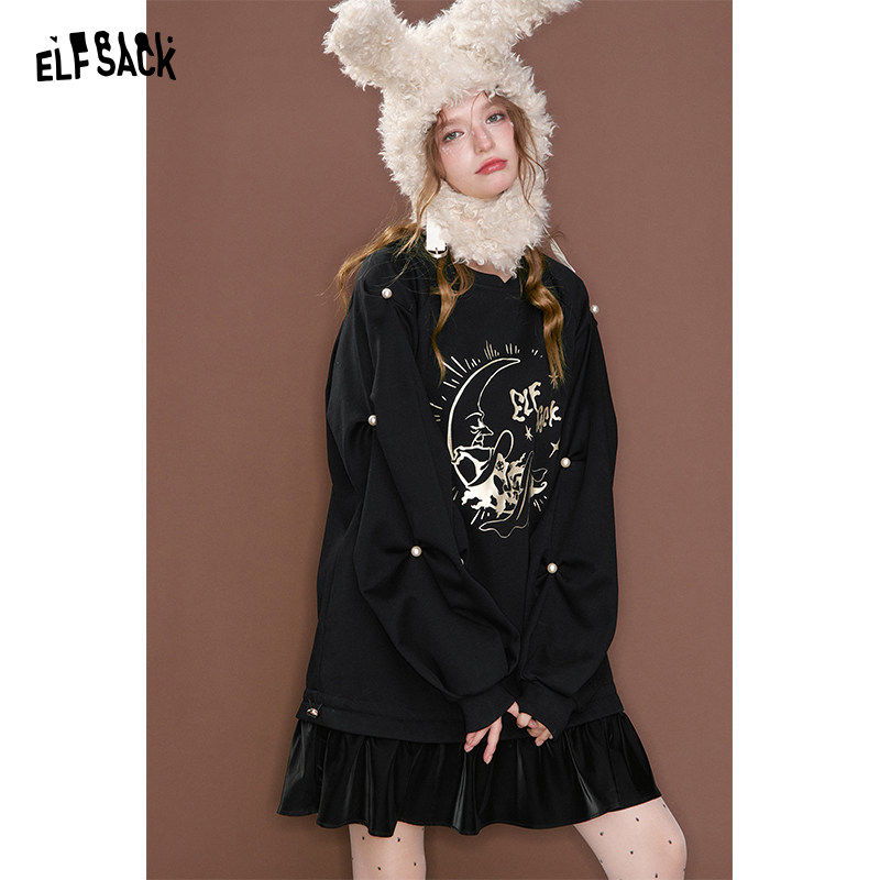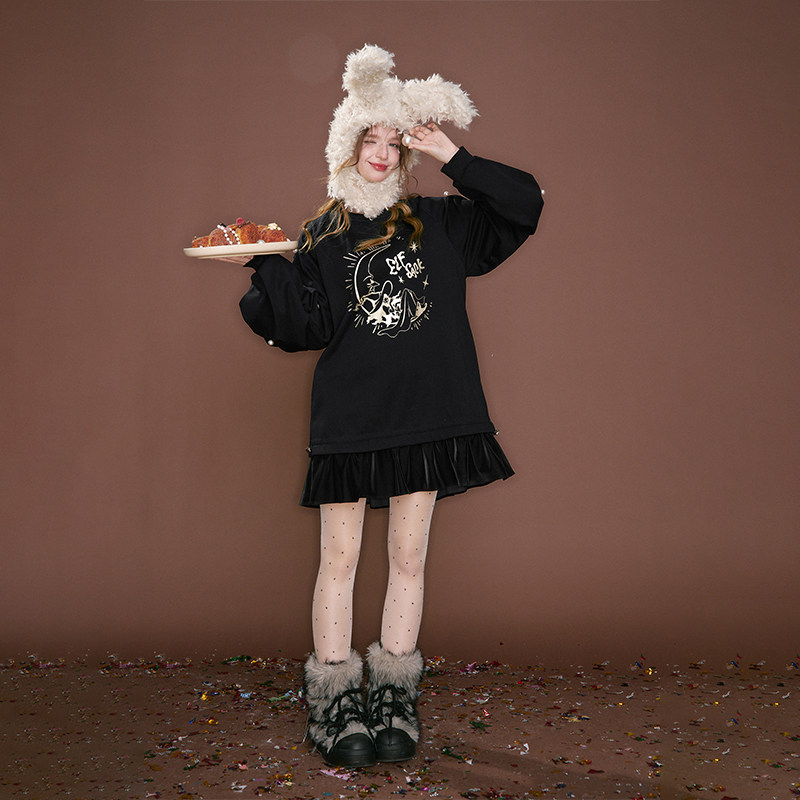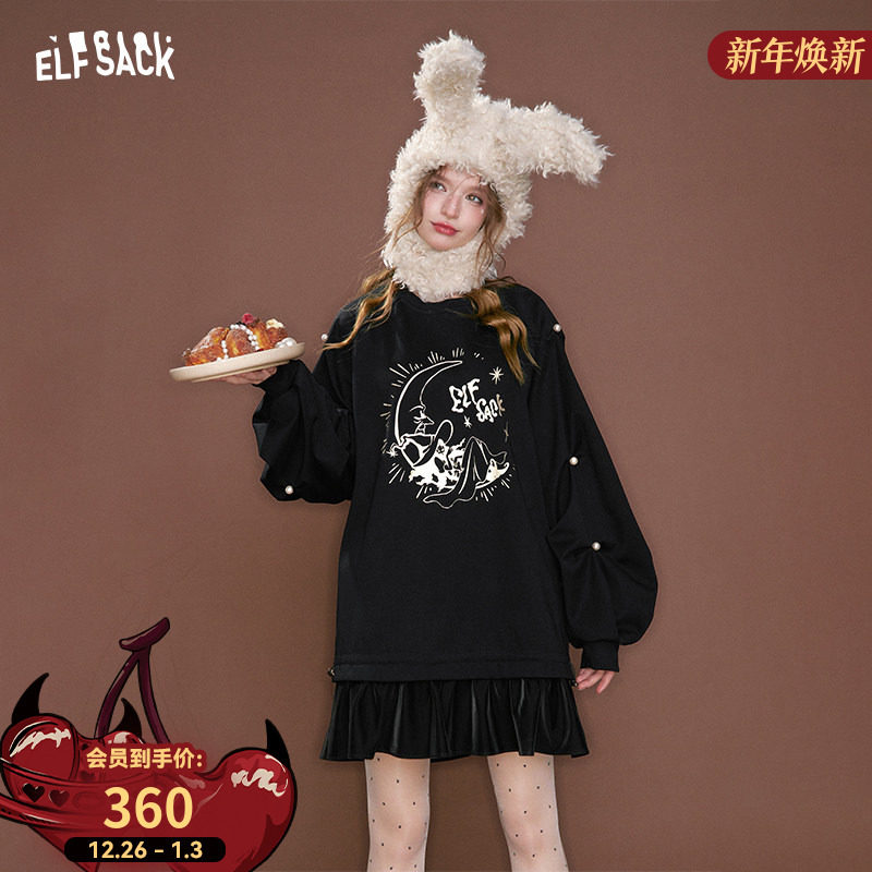 妖精的口袋黑色印花加绒卫衣连衣裙女2025年冬季新款新年穿搭裙子