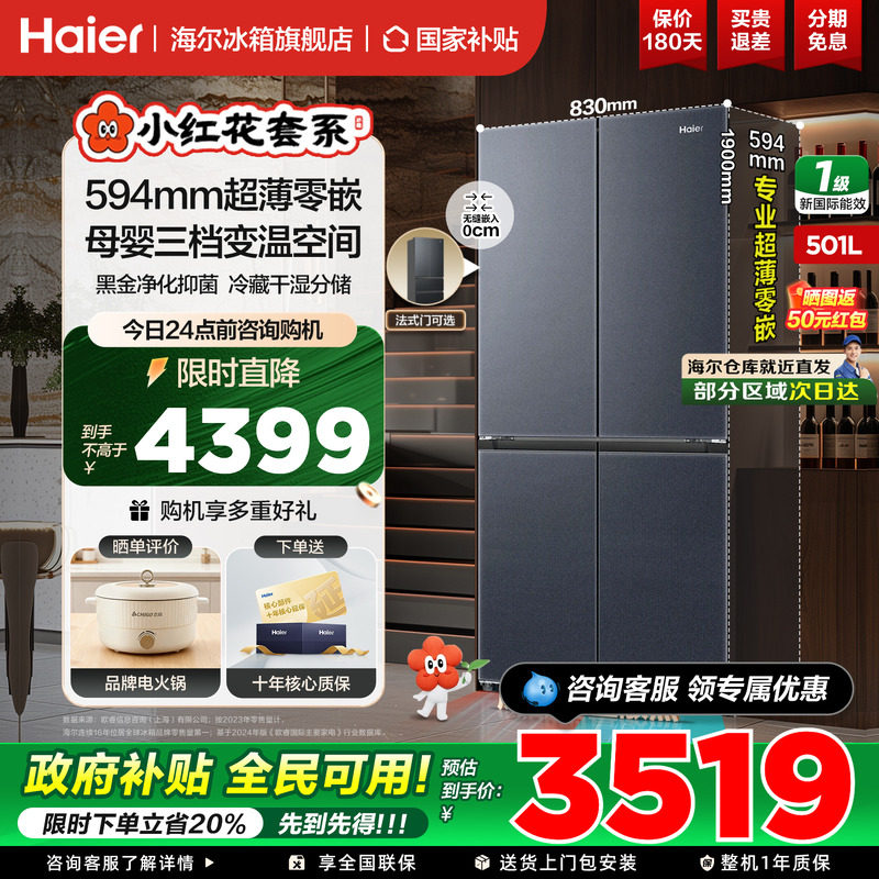 【小红花】海尔冰箱501L十字四开门超薄零嵌入式一级家用官方正品