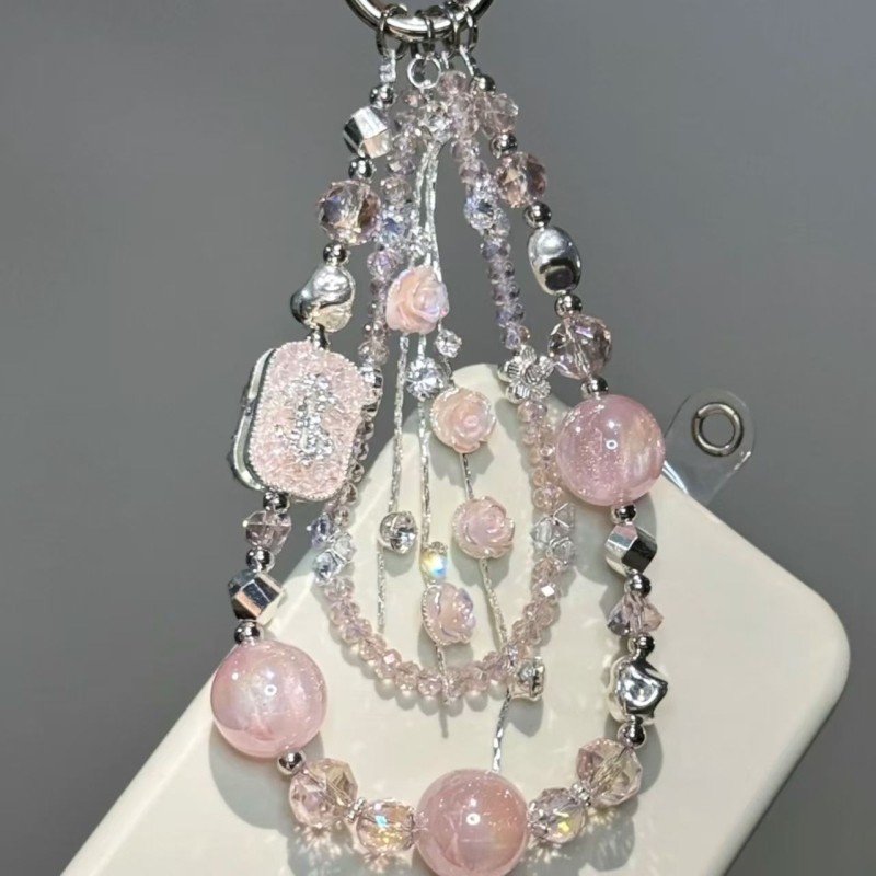 【招财玫瑰】粉色系细闪珠玫瑰流苏双层钱袋手机链高端挂饰包挂件