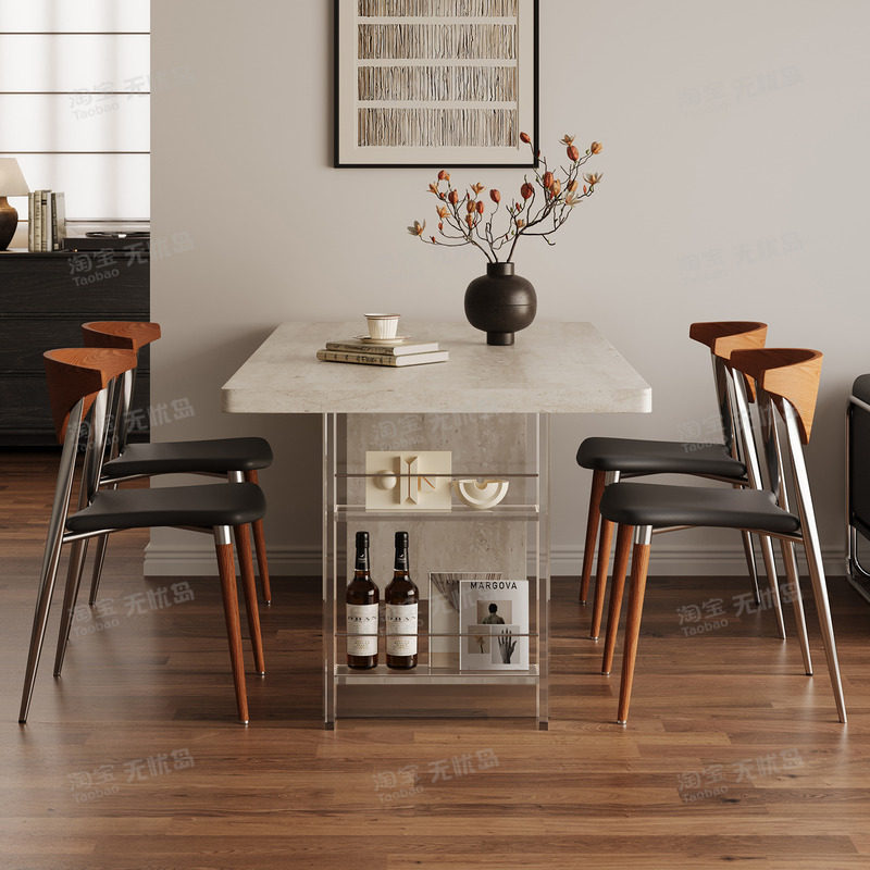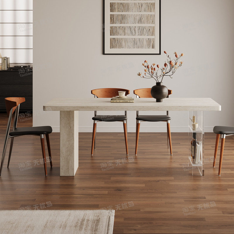 全包边洞石岩板餐桌实木长方形家用小户型桌中古风一桌四椅组合