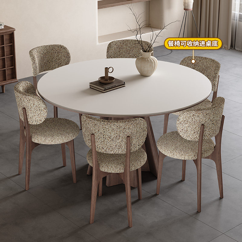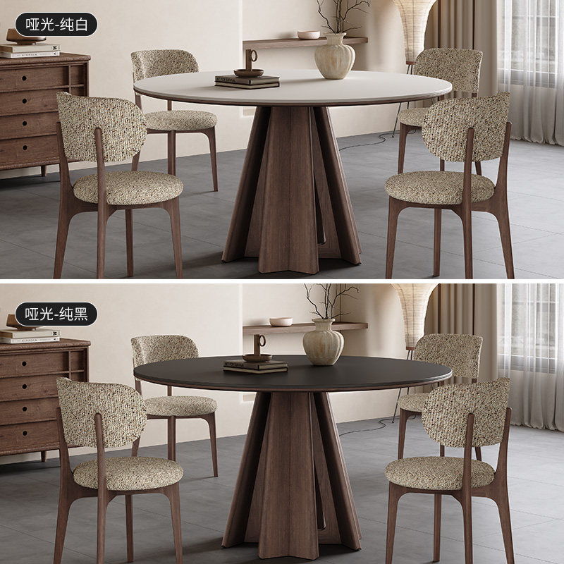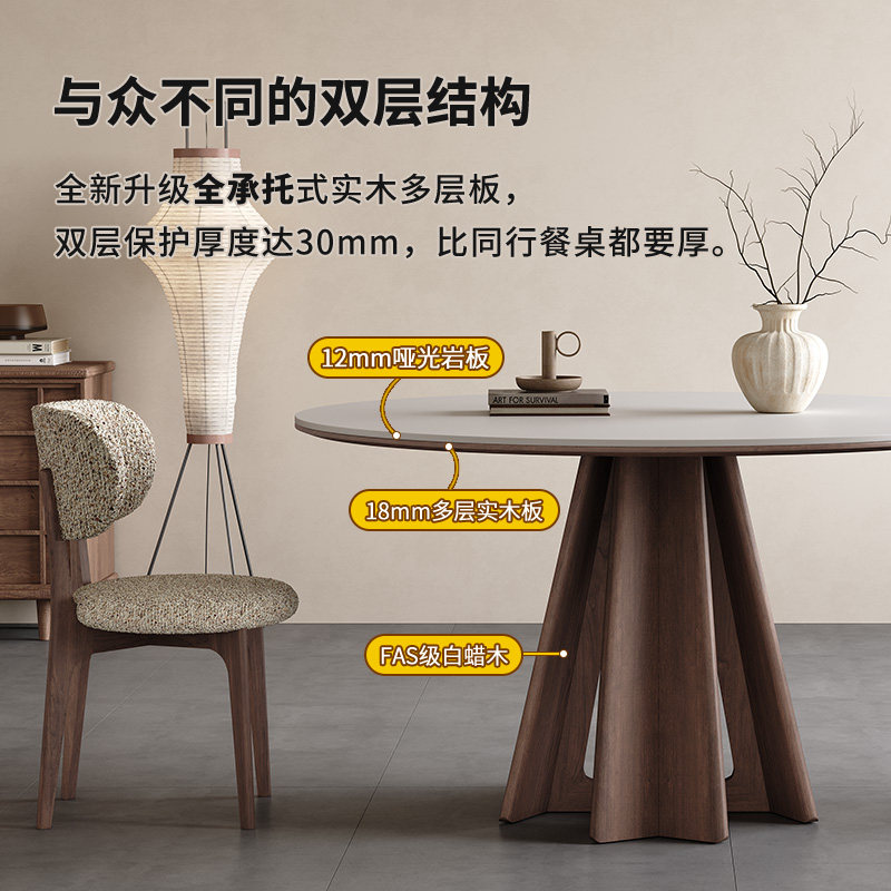 实木岩板餐桌圆形家用胡桃色2025新款极简侘寂风实木圆餐桌带转盘