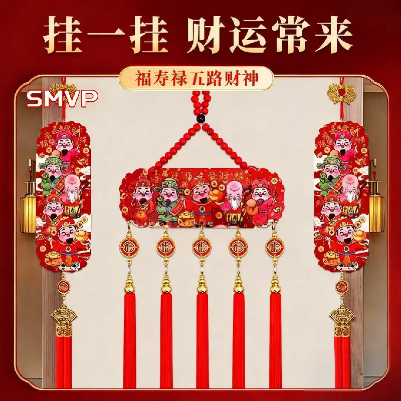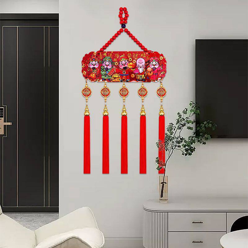 新年节日装扮五路财神挂件五福桃木浮雕流苏客厅春节喜庆2026挂饰