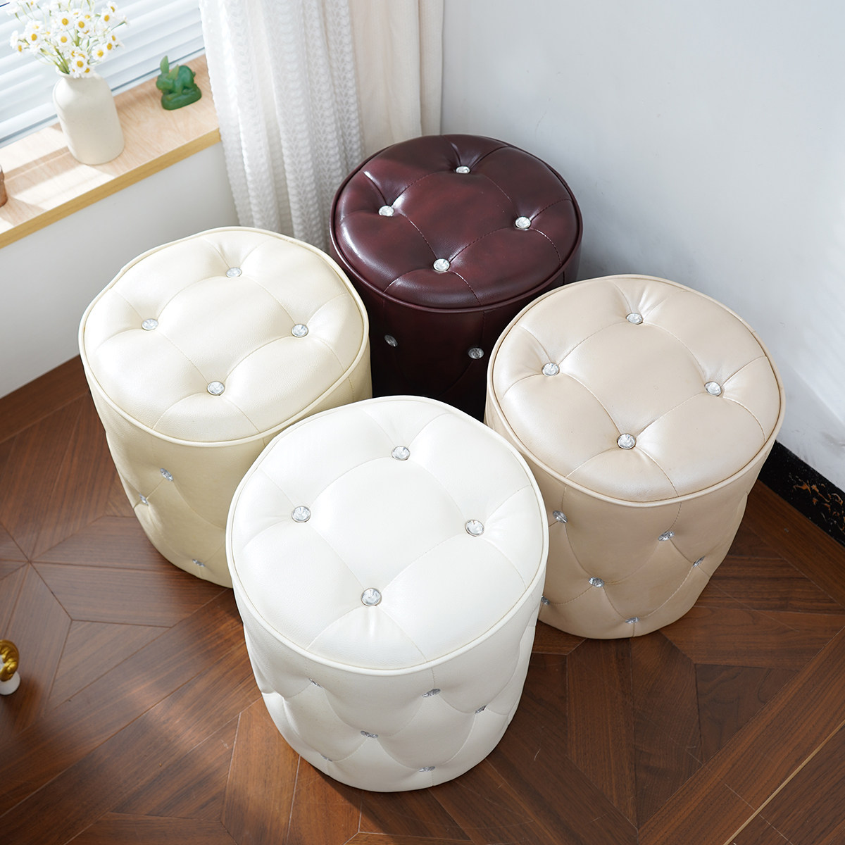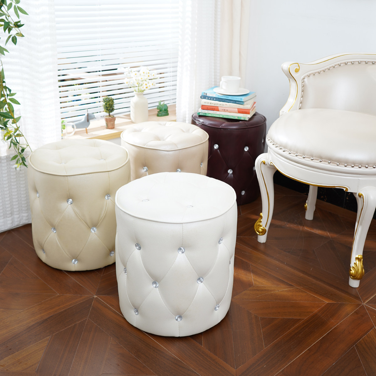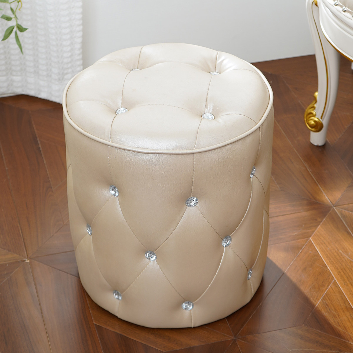 法式真皮菱形格脚踏凳圆凳沙发凳换鞋凳化妆小凳拉扣换鞋凳梳妆凳