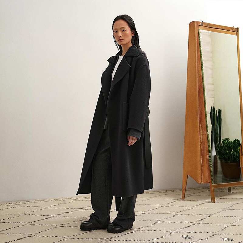 RUISHI芮时重磅驼绒桑蚕丝羊毛慵懒两穿领灰色毛呢大衣秋冬外套女