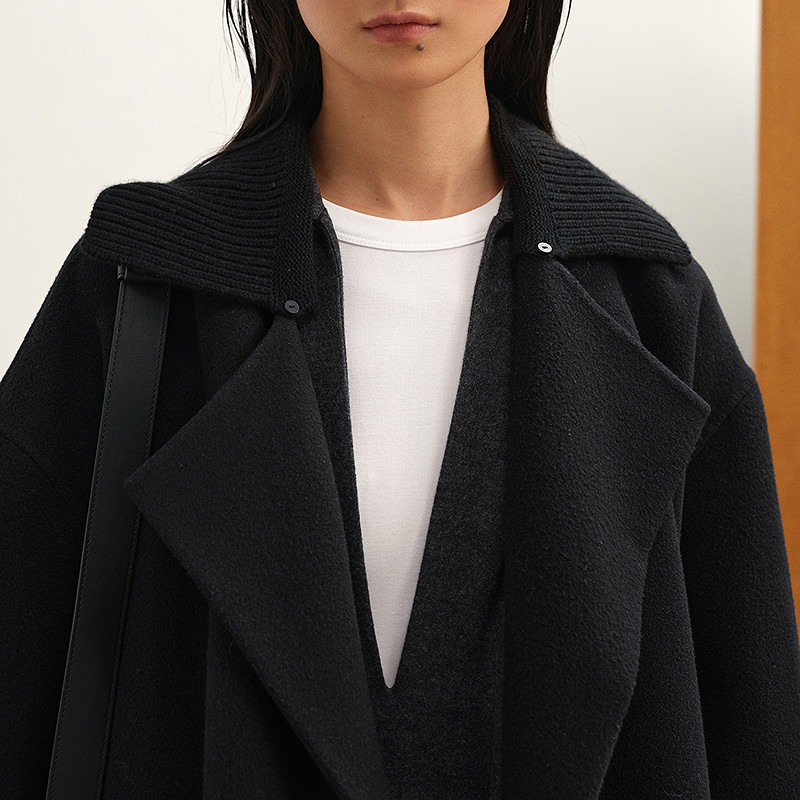 欧洲站斗篷立领双面羊毛呢子大衣外套系带假两件针织袖2025冬季新