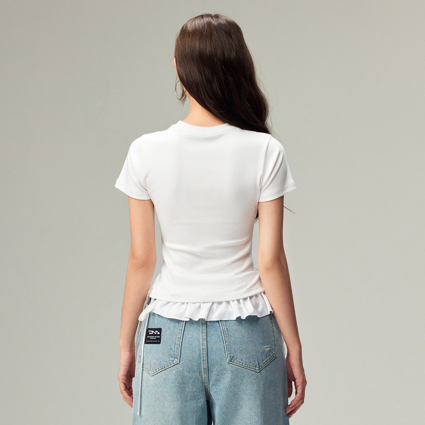 三福短袖T恤女2026新款夏季褶皱设计感修身圆领短款白色上衣女装