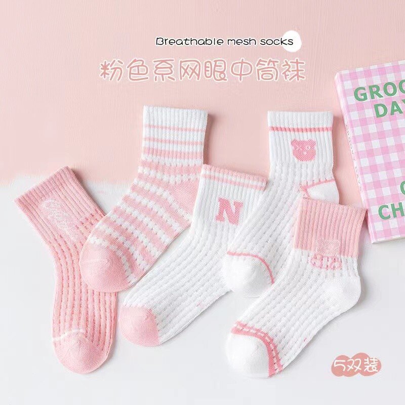 透气防臭女童袜子薄款夏季女孩春夏网眼袜夏天可爱小熊中筒袜卡通