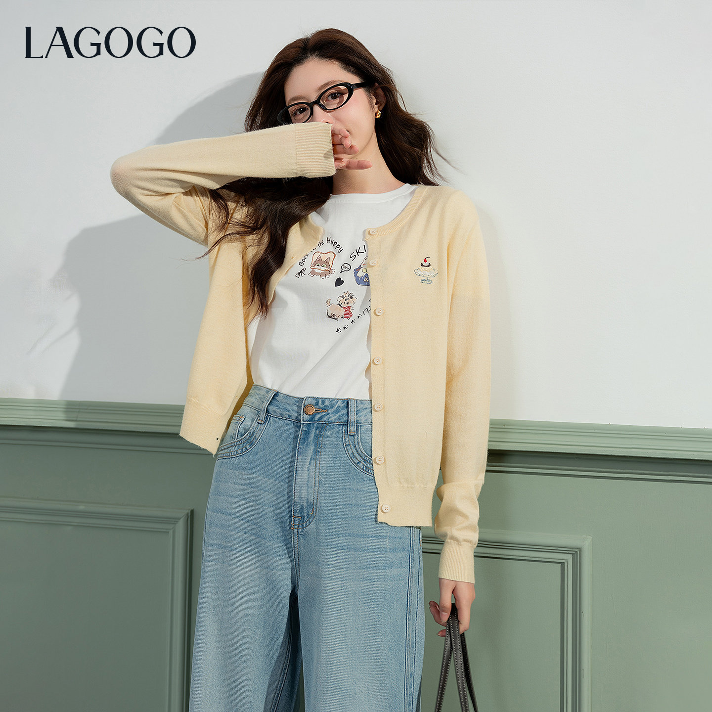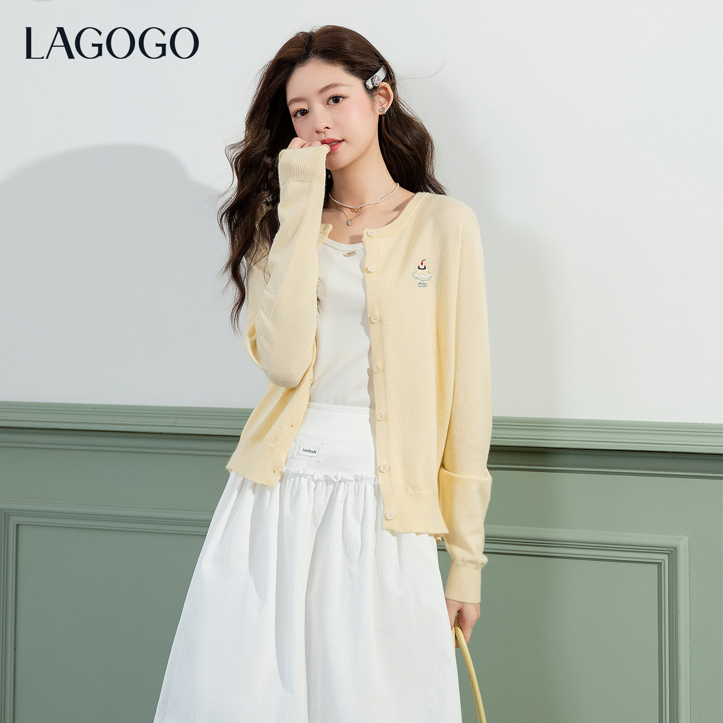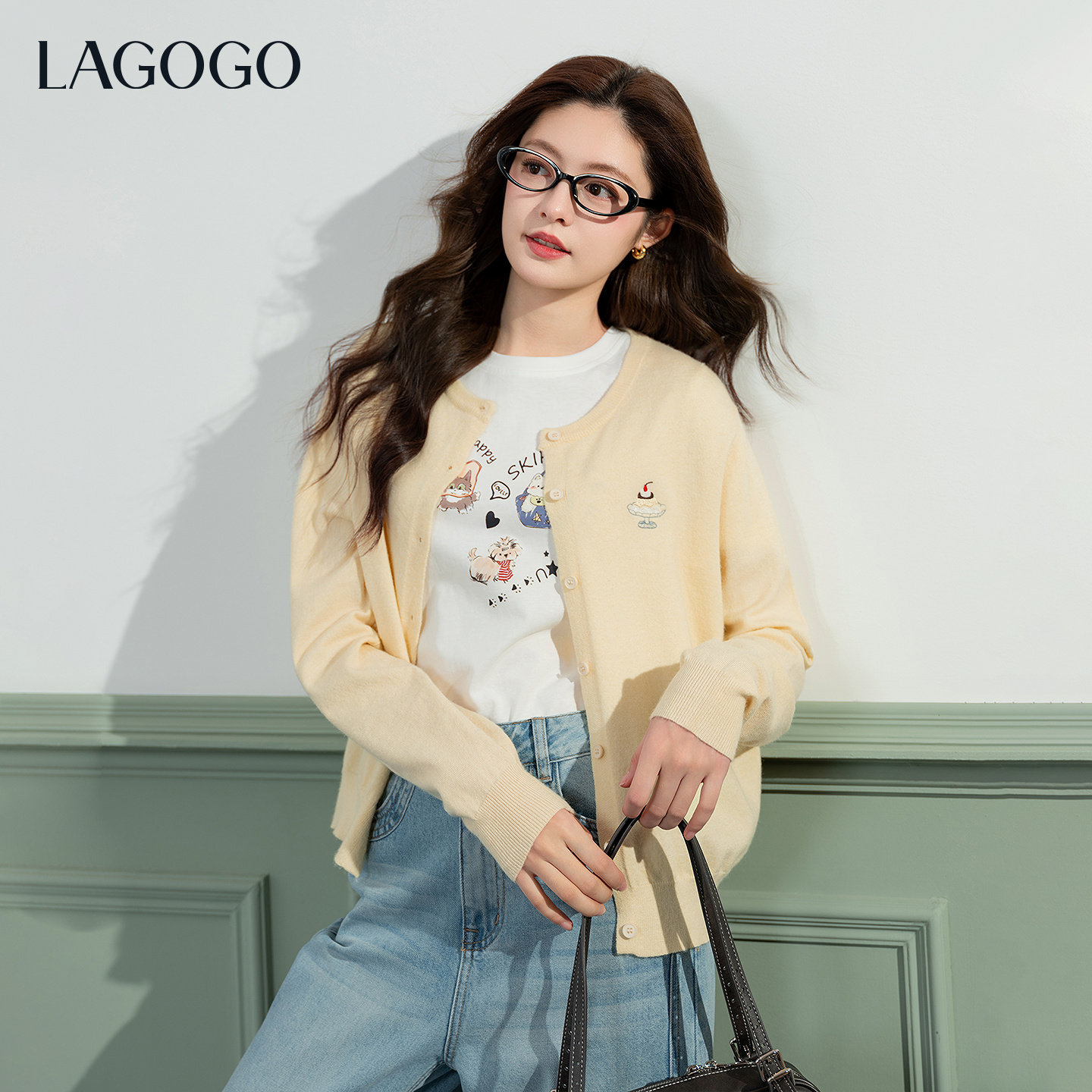 LAGOGO奶黄蛋糕刺绣毛衣开衫外套女拉谷谷2026春季新款明媚针织衫