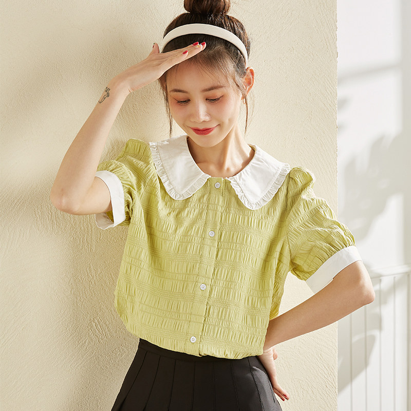 夏季短袖衬衫女薄款雪纺衬衣娃娃领泡泡袖法式方领上衣
