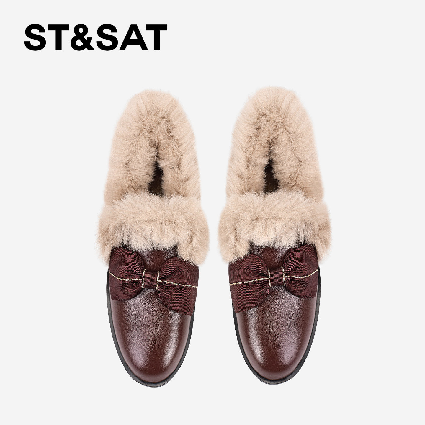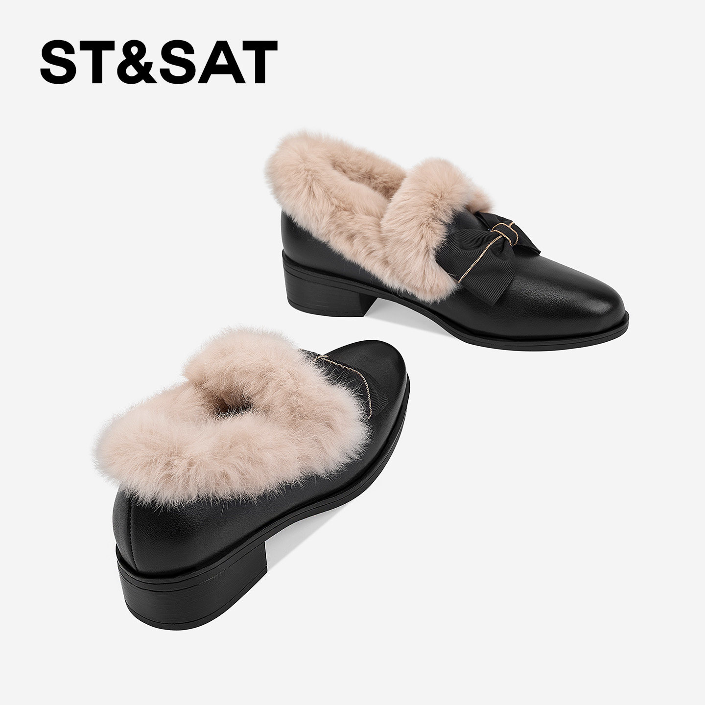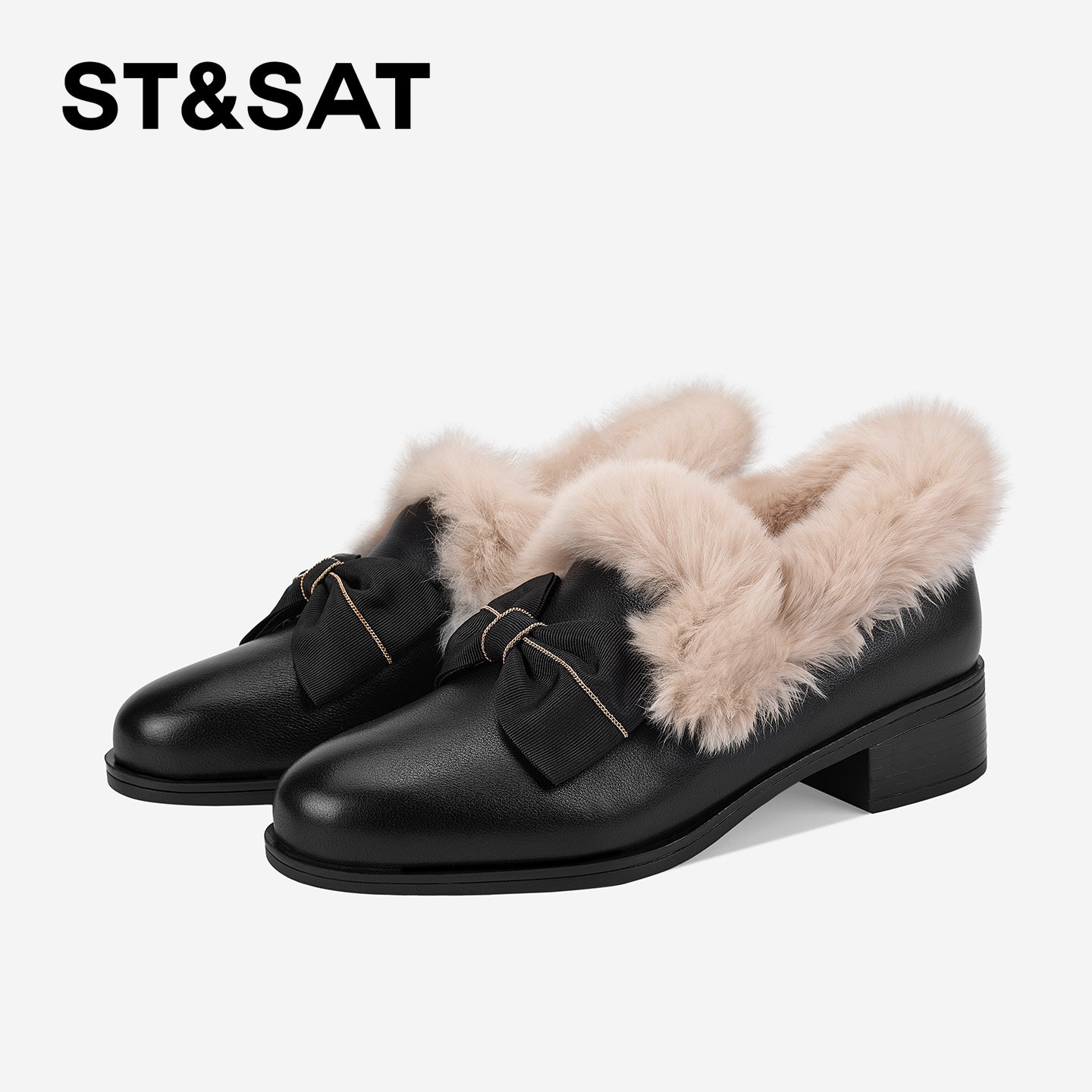 星期六毛茸茸毛毛鞋女2025春季新款蝴蝶结装饰中跟兔毛加绒小皮鞋
