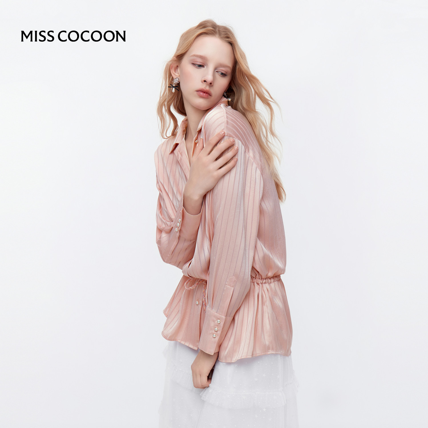 MISSCOCOON可可尼粉色长袖上衣女2025秋季新款缎感条纹衬衫外套