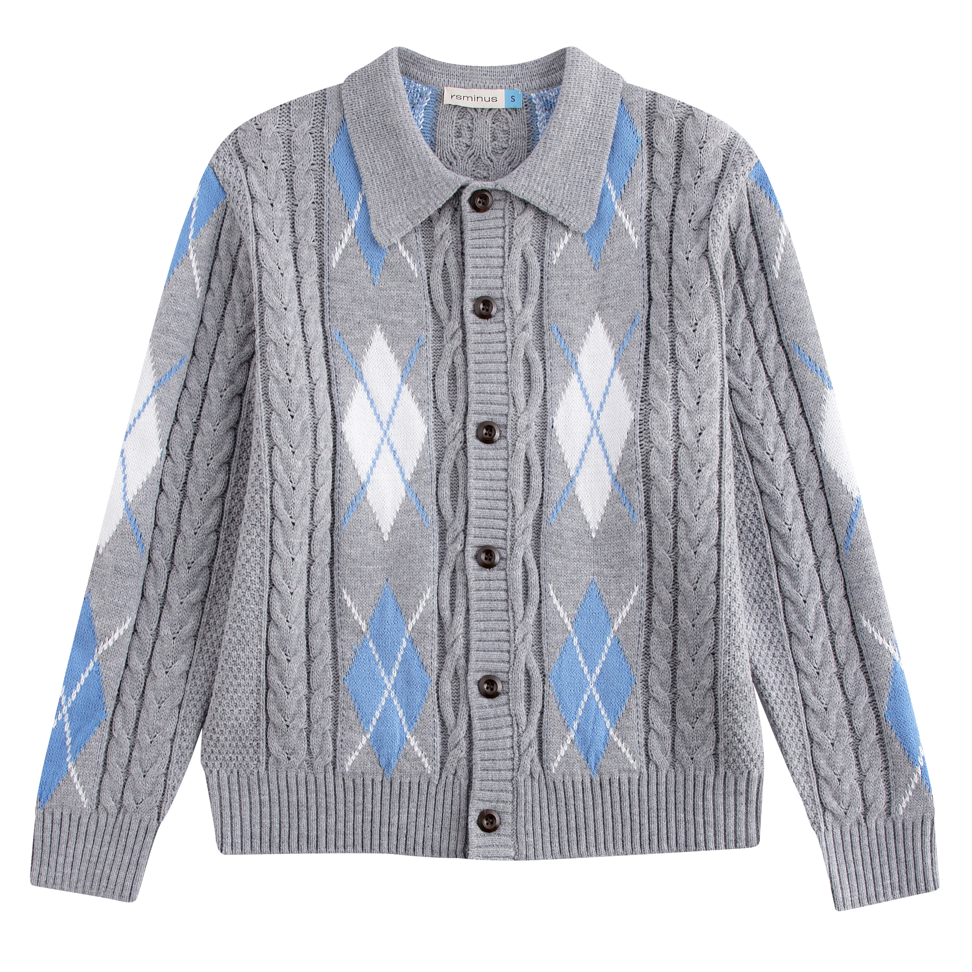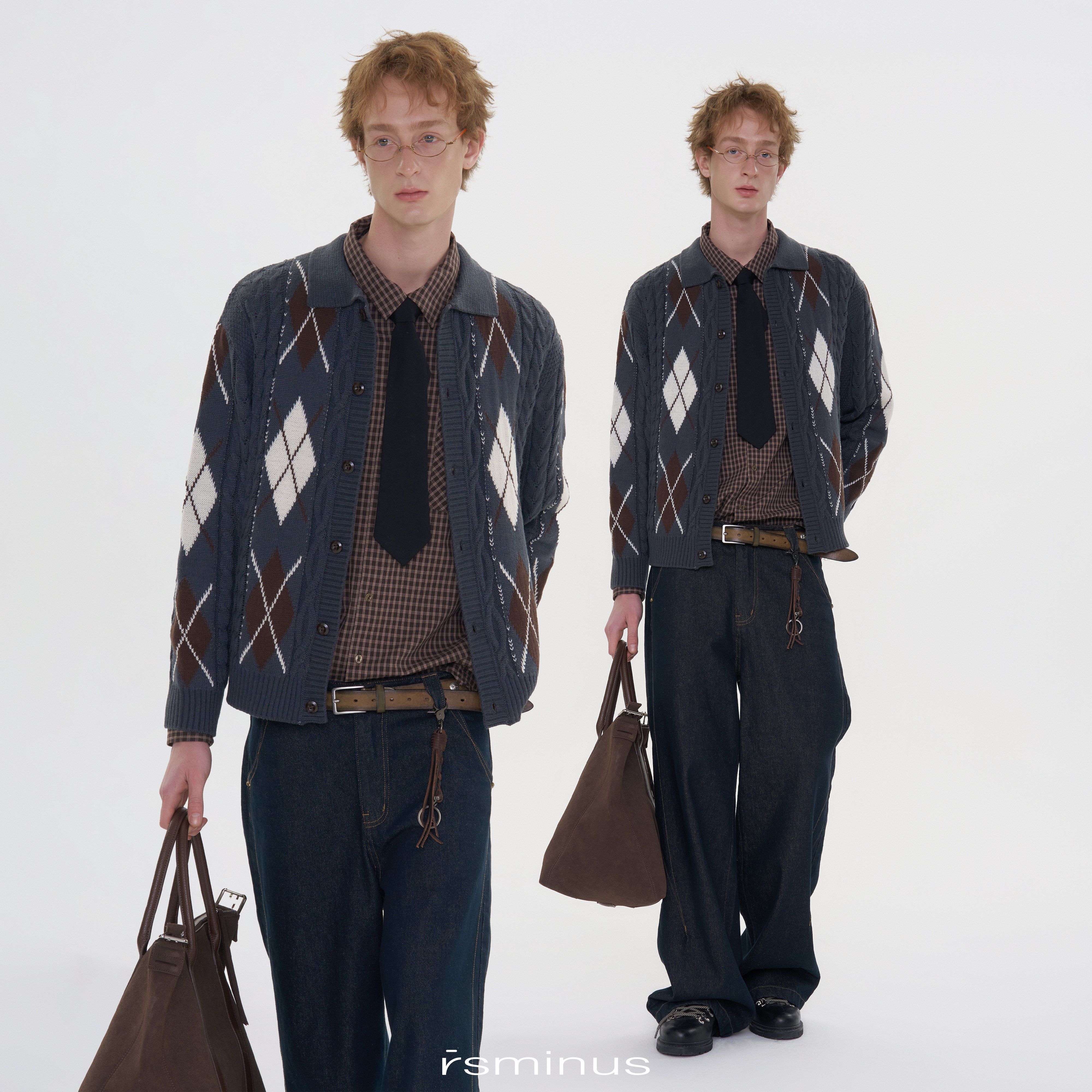 riverstone男女同款美式复古菱形格绞花毛衣外套春季新款针织开衫