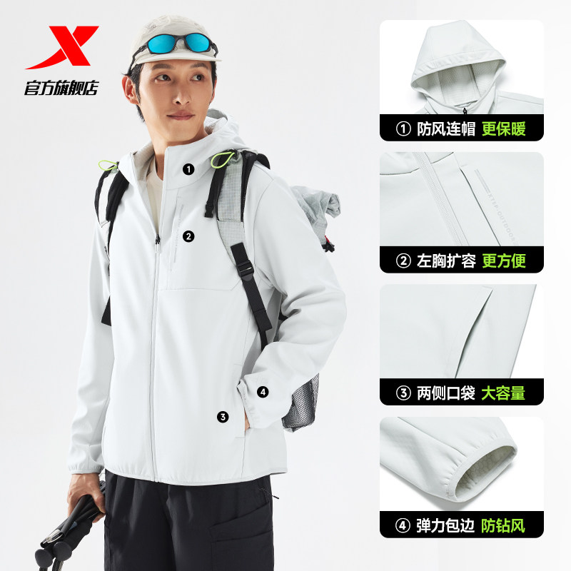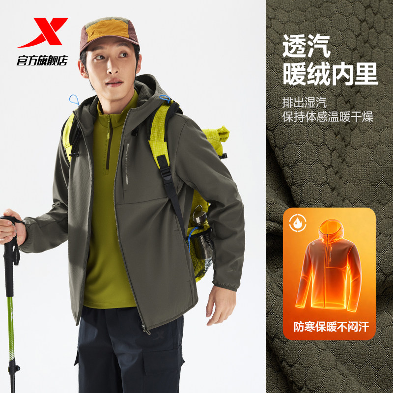 特步羽翼软壳衣2.0男士户外冲锋连帽运动风衣登山服加绒防风外套