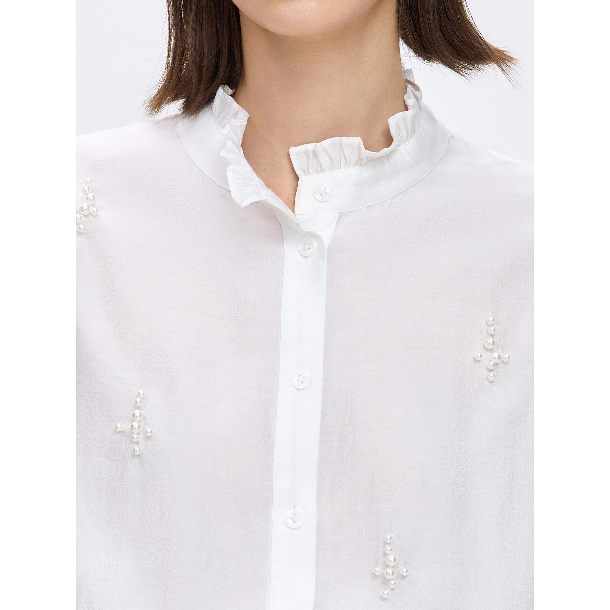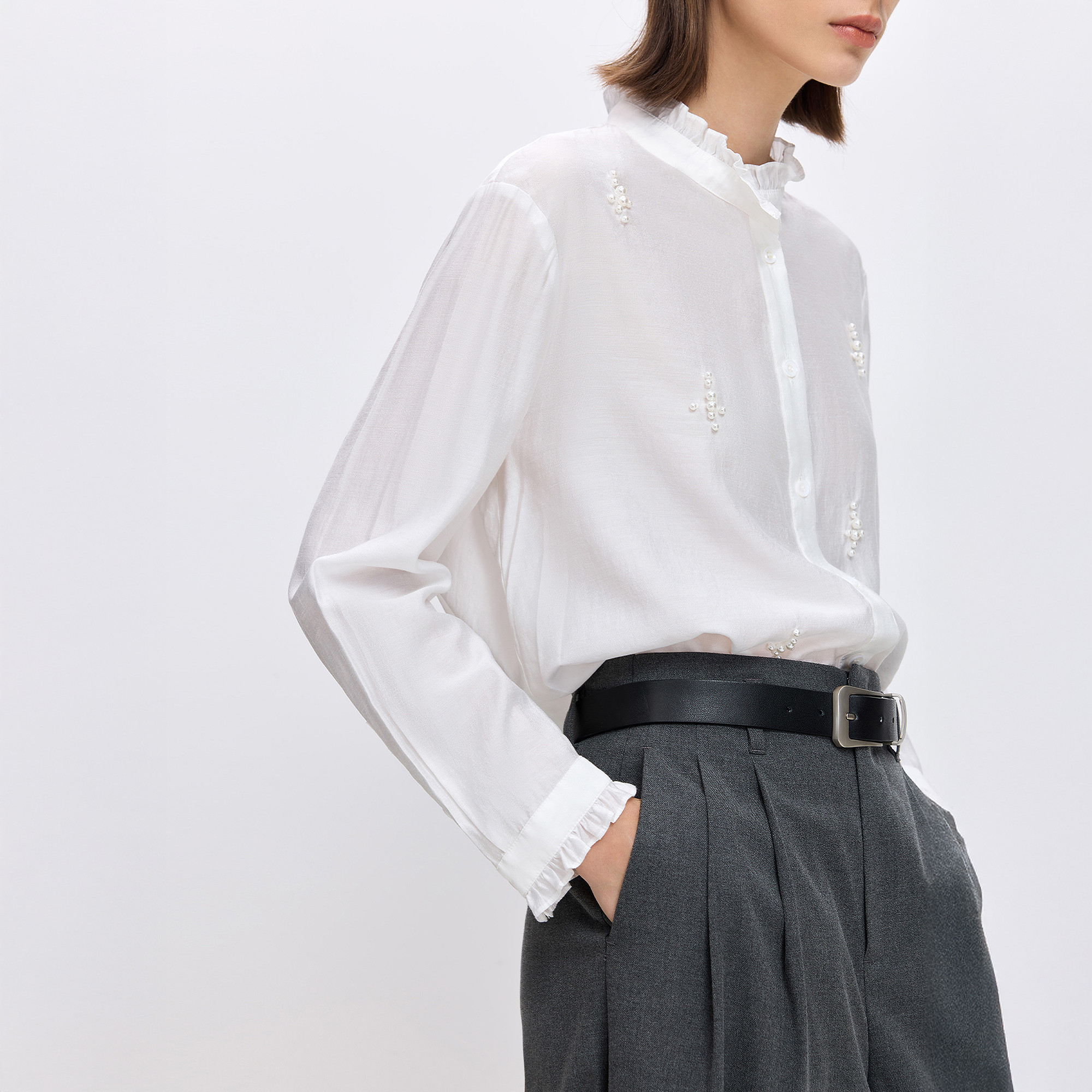 LILY2026春新款简约法式珍珠钉珠荷叶边垂感气质通勤米白色衬衫女