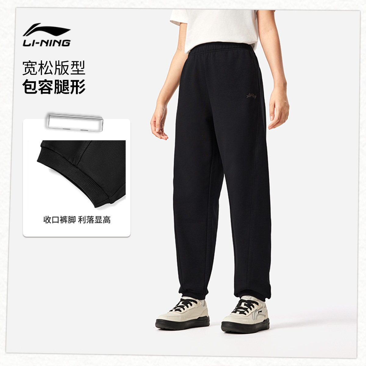李宁卫裤女士春秋新款通勤裤子休闲长裤宽松束脚黑色跑步运动裤女