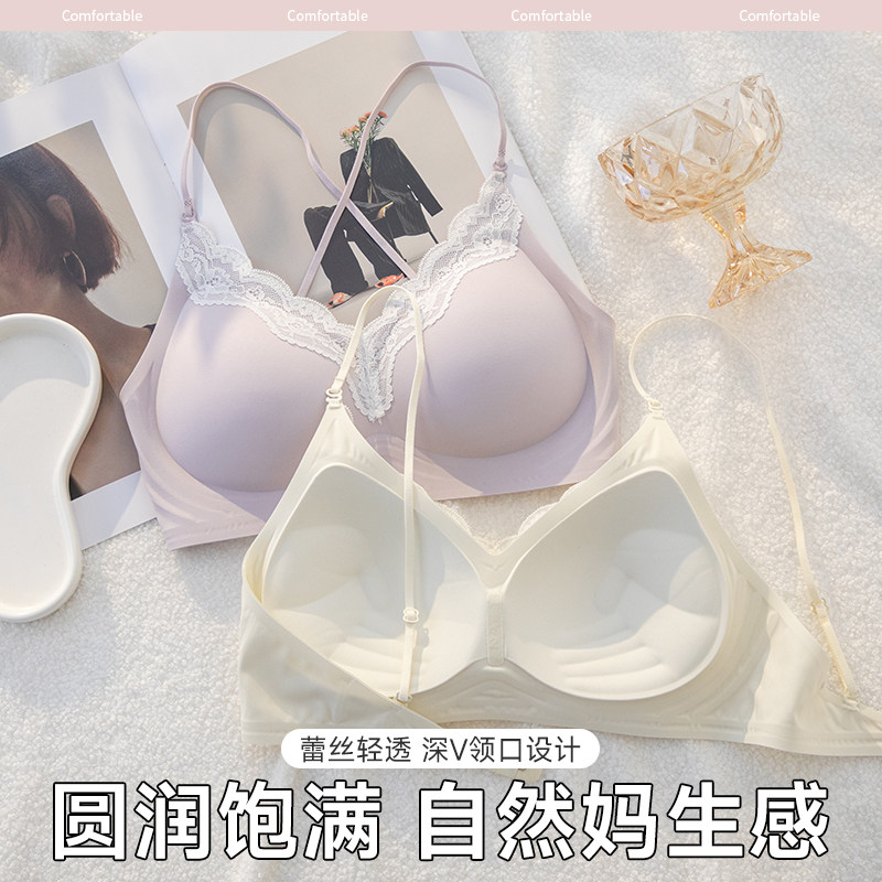 细肩带挂脖美背内衣女小胸显大不空杯一体式固定杯少女蕾丝文胸罩