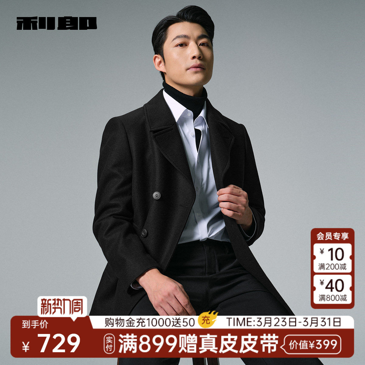 【翻领双排扣】利郎官方中长款毛呢大衣男士冬季男装羊毛外套