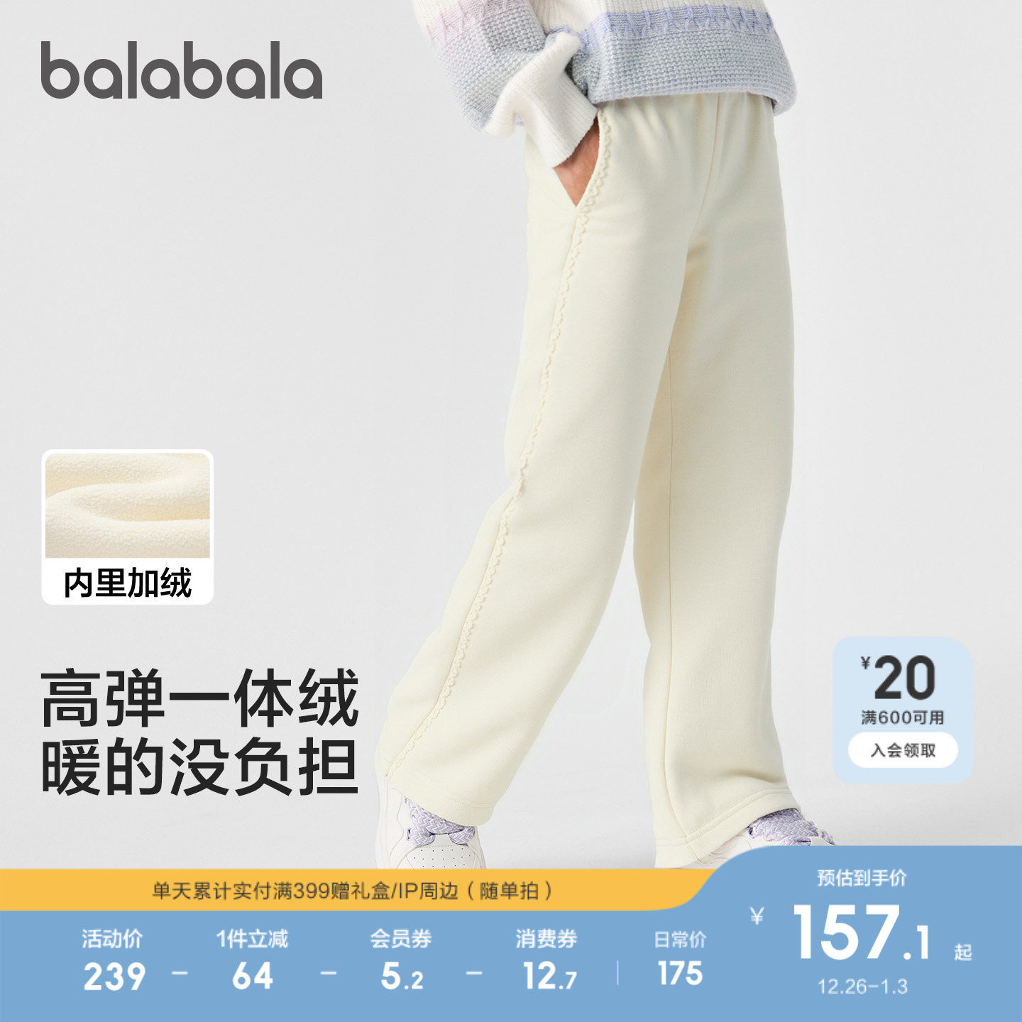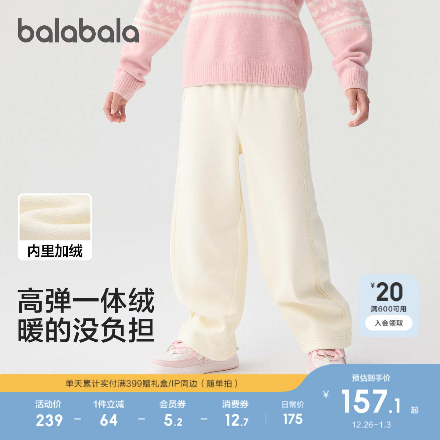 【商场同款】巴拉巴拉童装儿童加绒裤子女童直筒裤2025冬新款保暖