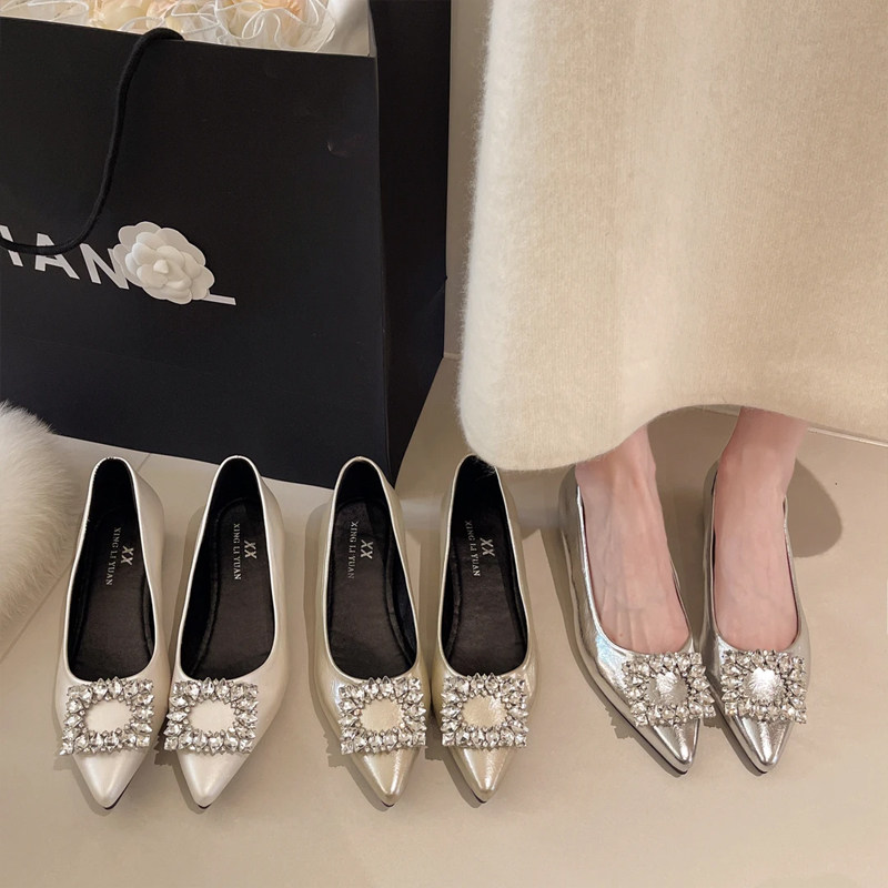 内增高尖头银色单鞋女2025新款秋季浅口瓢鞋方扣水钻玛丽珍小皮鞋