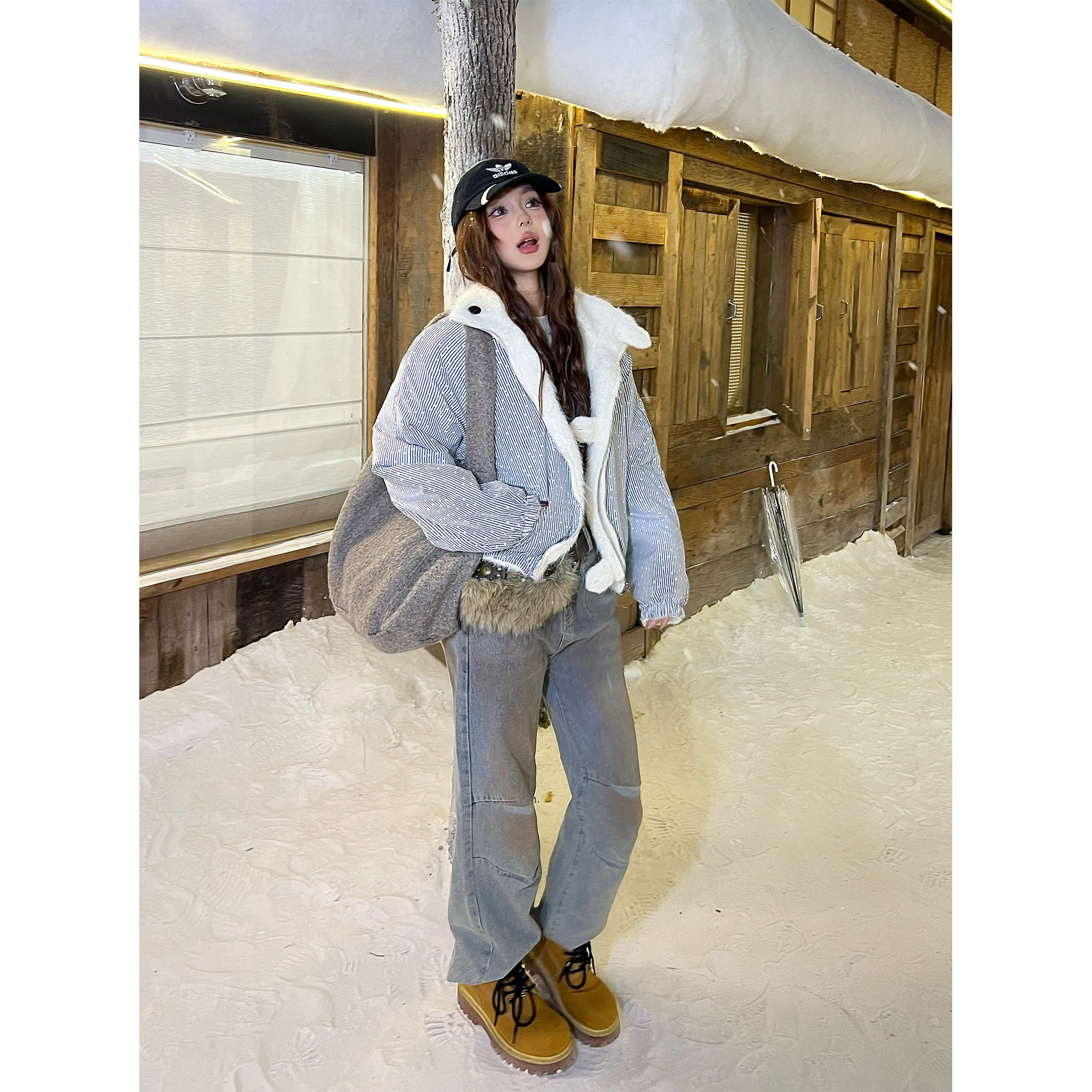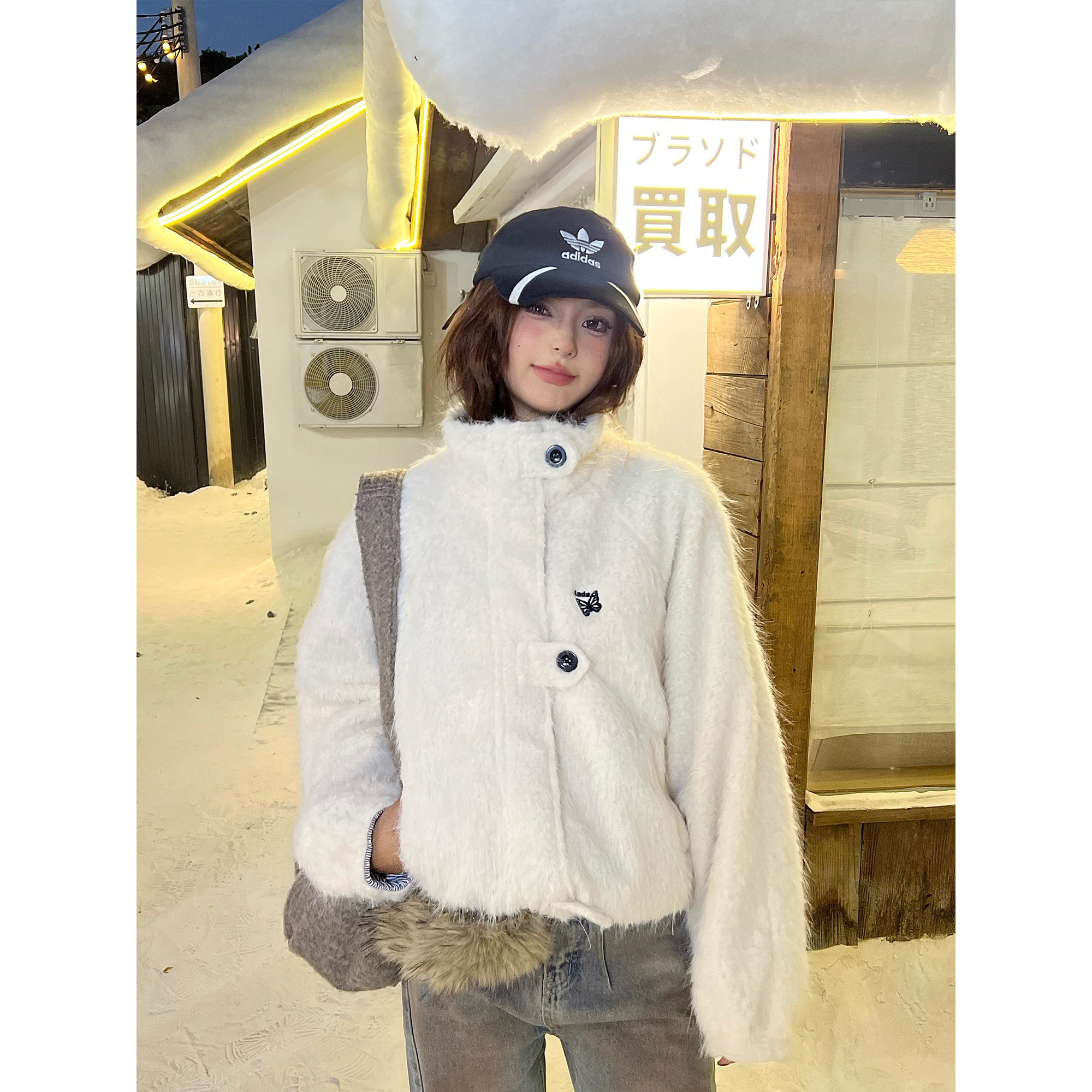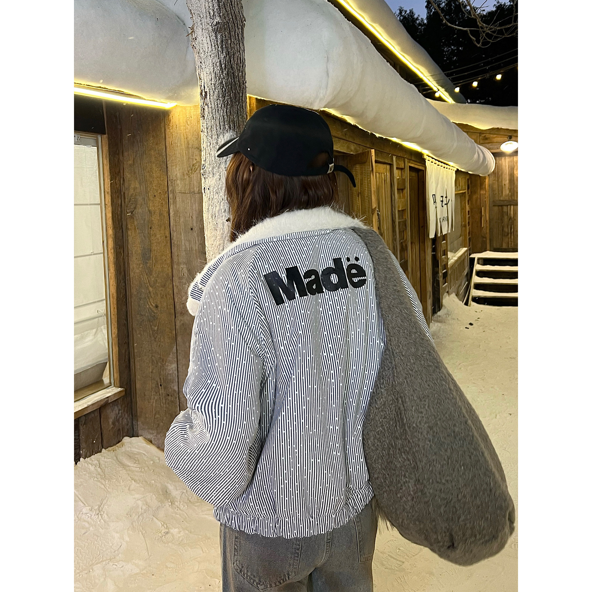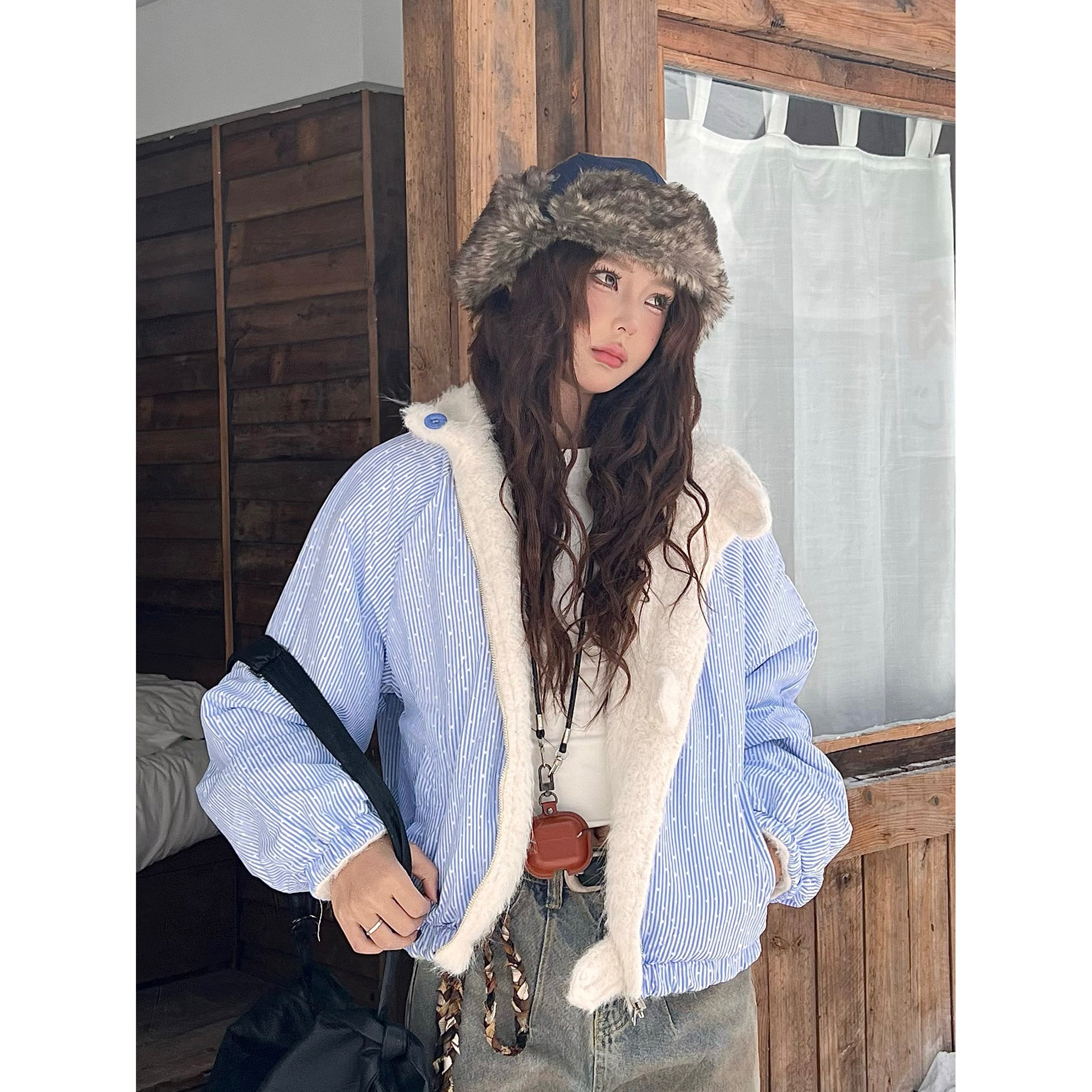 OPUP 美式条纹波点立领毛绒夹克双面穿男女秋冬季加绒保暖外套
